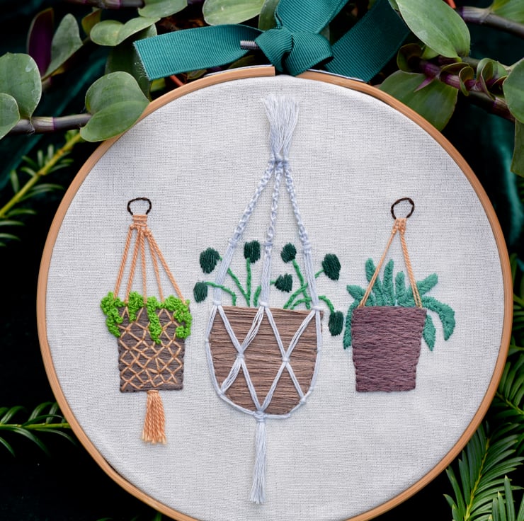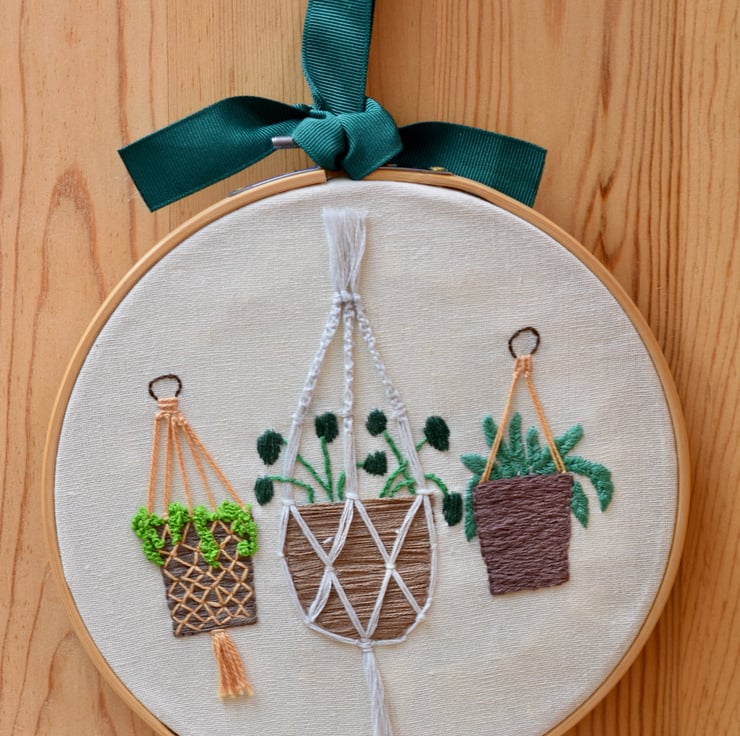These three hanging baskets have been hand embroidered onto a natural, cream linen and mounted in a 6" bamboo embroidery hoop. Each hanging basket has its own individuality. The middle basket's hanging has been made using macrame technique in miniature. The hoop is backed with cream felt and there is a small piece of green ribbon to hang the hoop up with.