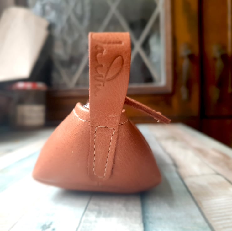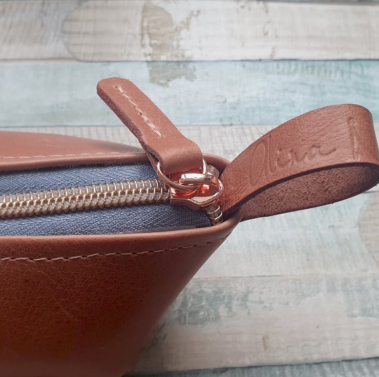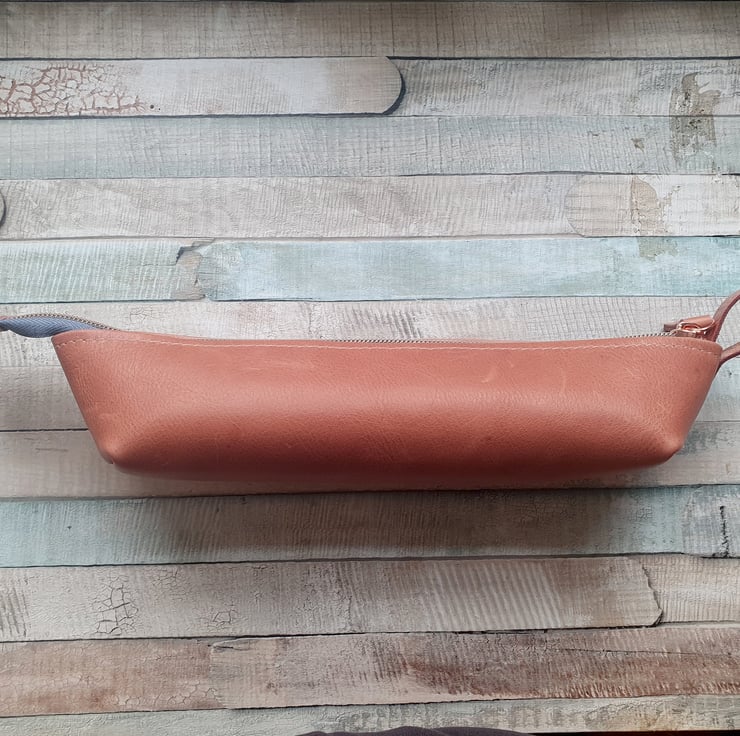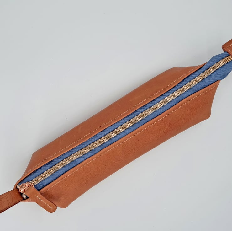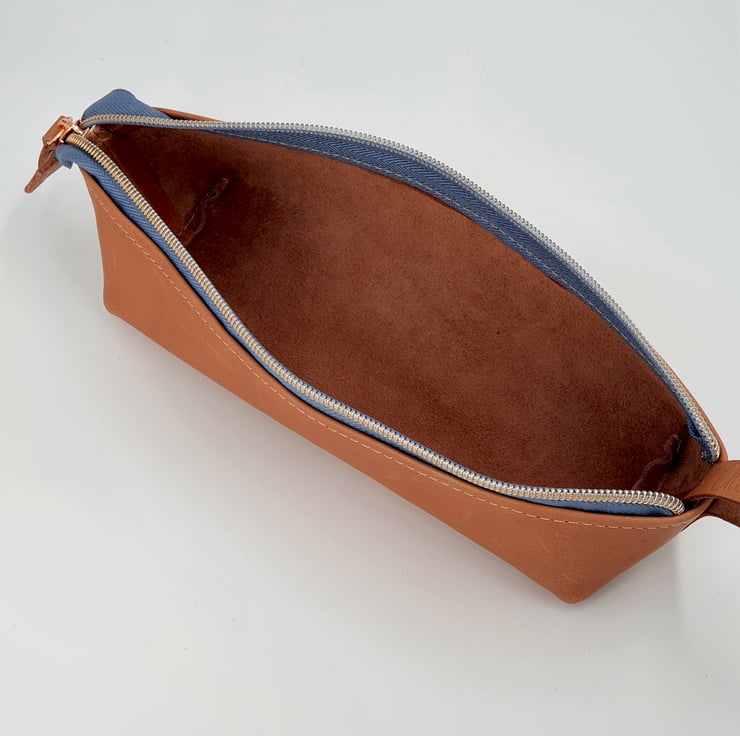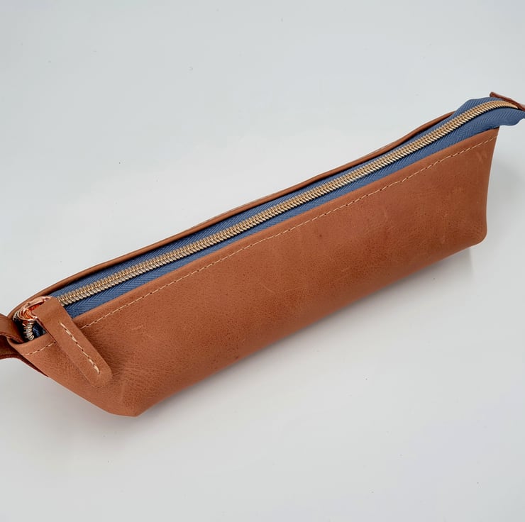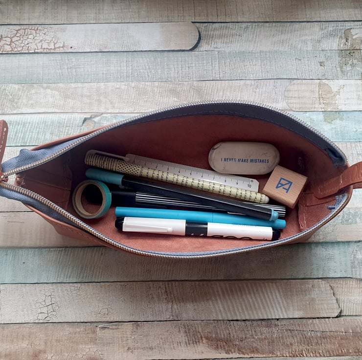 Leather pencil case in a natural tan/ brick shade, peach/orange veg-tanned leather with a contrasting pale blue zip tape.