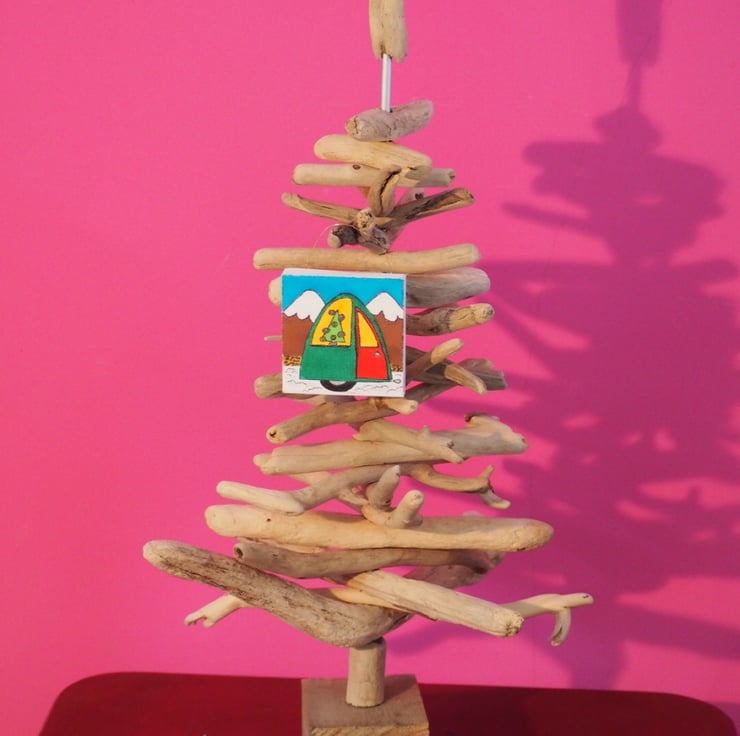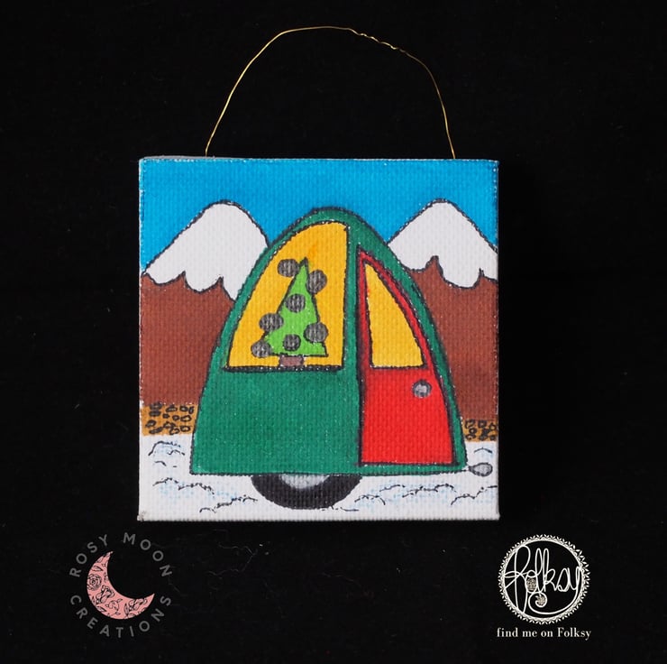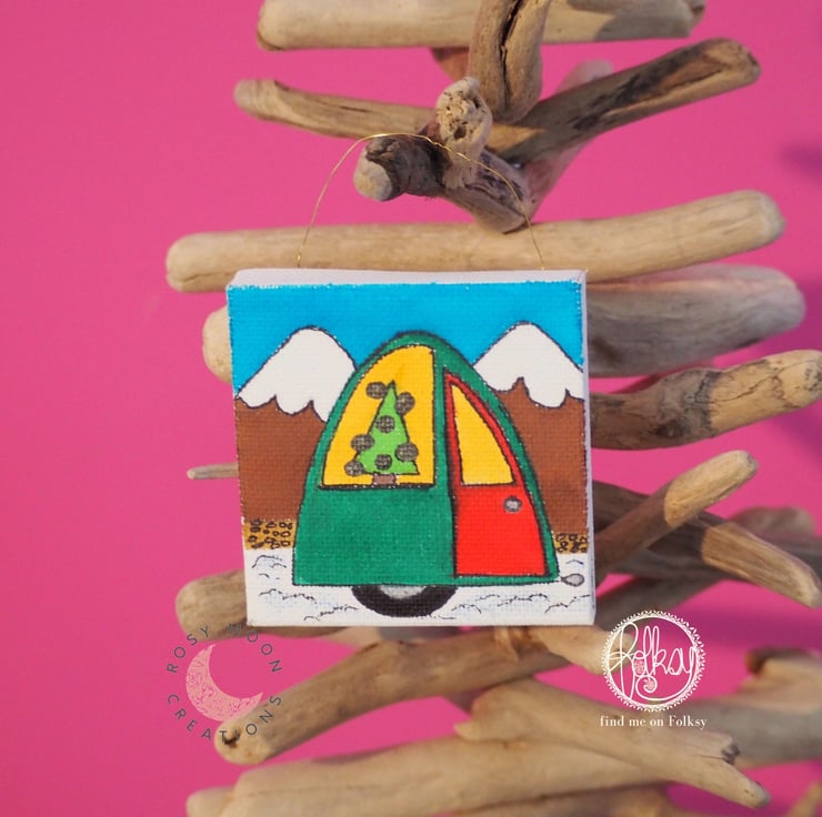 This 7x7cm Christmas caravan decoration has been hand drawn by myself in bright cheerful colours. The canvas is hung from the tree with an upcycled copper wire.