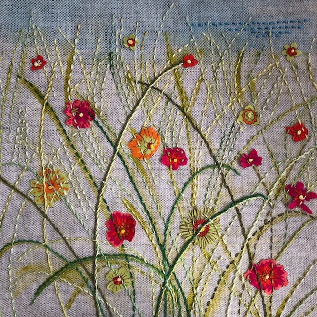 Inspired by a field of wild flowers on a walk this picture is made of hand stitched appliqué flowers (from a Liberty print) on a hand painted background.