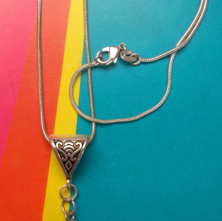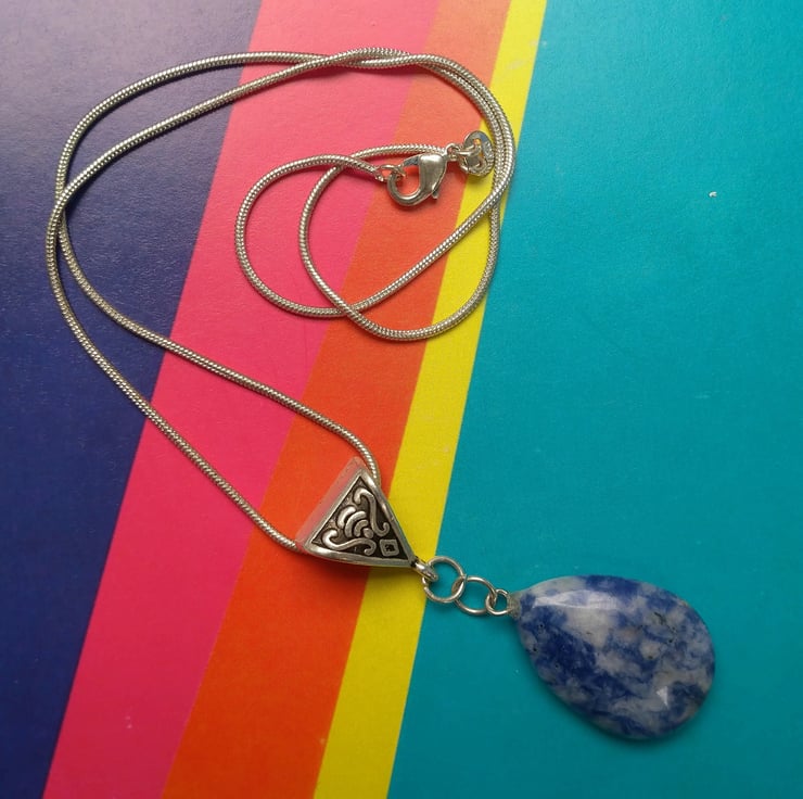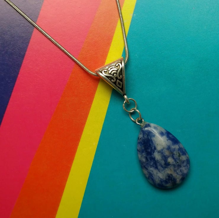 What a gorgeous Blue Spot stone pendant. A teardrop shaped flattened stone in a glorious blue. Hanging on a Tibetan silver embellished hanger on a sterling silver snake chain available in 16", 18" and 20" length. Please state your preference for chain length when placing your order.
