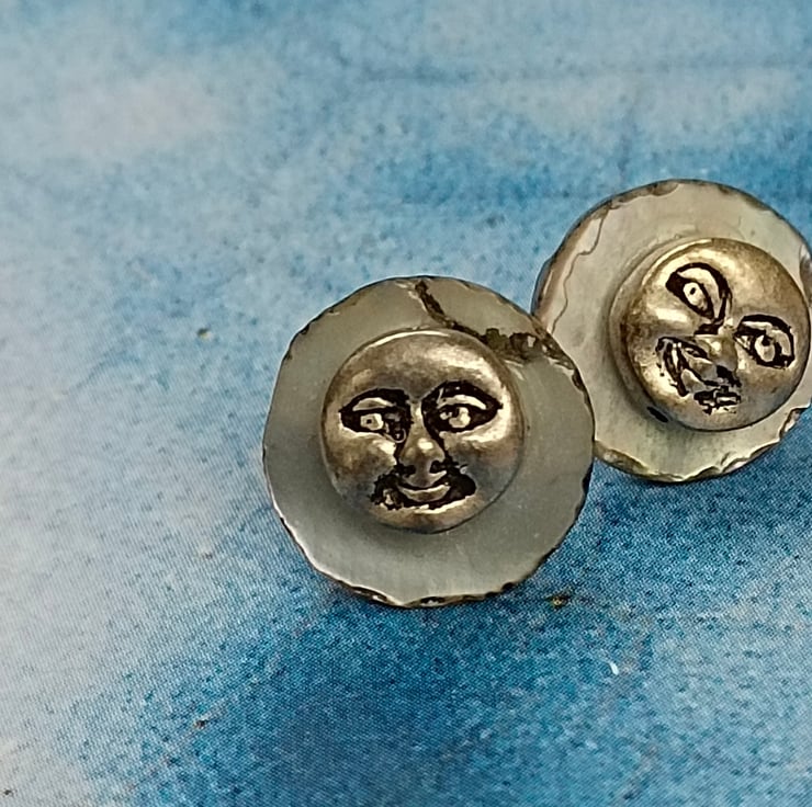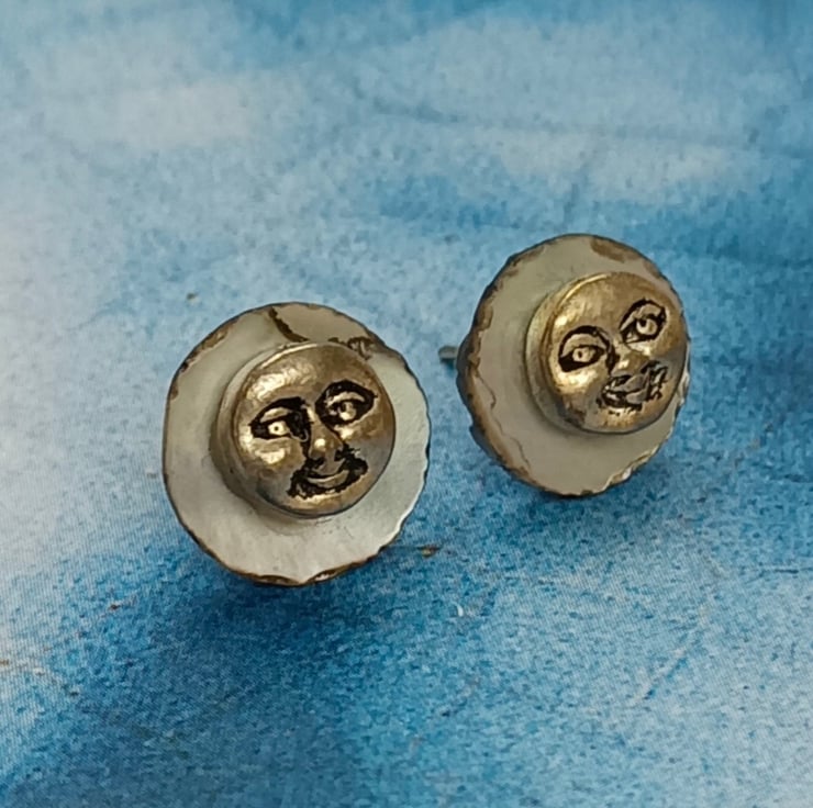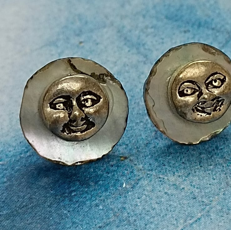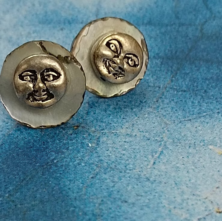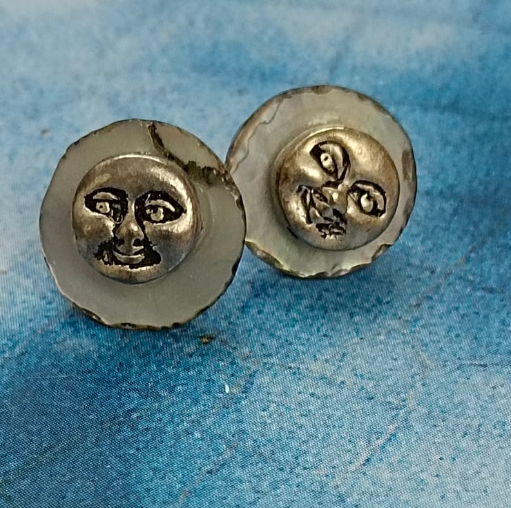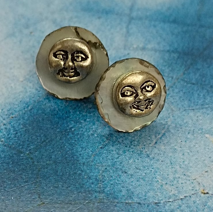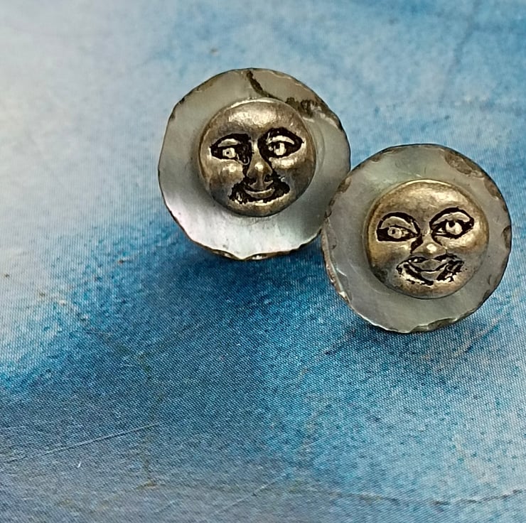 These earrings are smiley happy and unique! Made with delicate shell discs in a pale iridescent blue with tiny smiley happy Tibetan silver faces. With sterling silver nickel free pin and butterfly fasteners on the reverse and free UK postage! Happy Earrings!