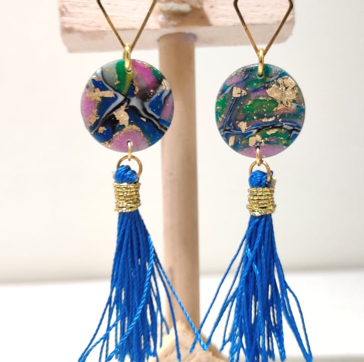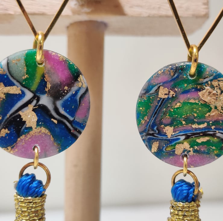 Hand made polymer clay earrings with an abstract pattern and gold foil with sealant, connected to a gold coloured stud and tassles. Small/medium sized. Stud fixing which can be painted with hypoallergenic coating for free on request. Please see all photos for close up detail. All products handmade therefore there may be minor imperfections. Each pair sold as seen, message for more info
