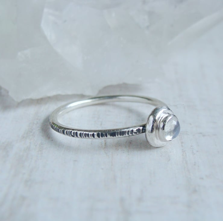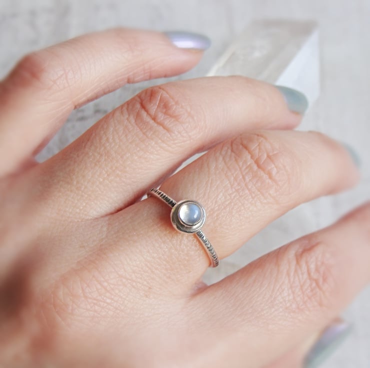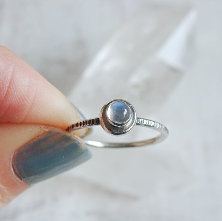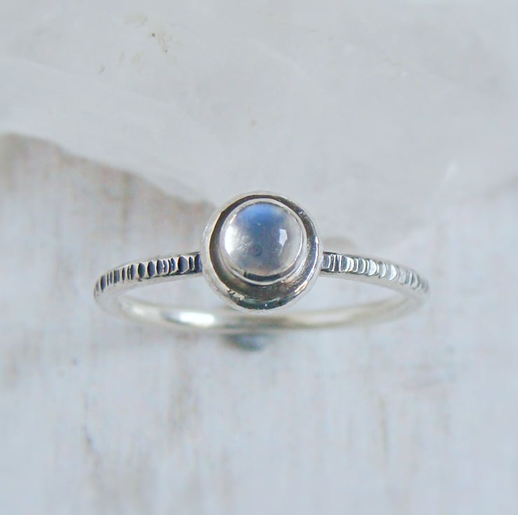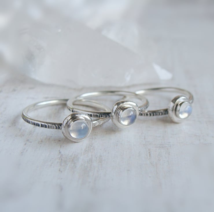 Organic pebble shapes made from recycling my scrap silver with blue moonstone gems stacked on top of my signature woodland hammered skinny ring bands.