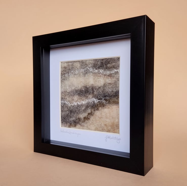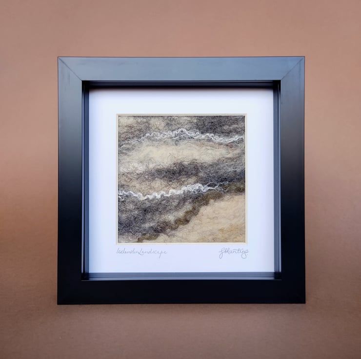 This work is created in wool felt - some of it was brought back from my trip to Iceland. I have laid tencel fibres on top of wool - these fibres are distorted as the wool felts and the effect created suggests the energy of the weather.