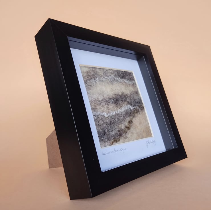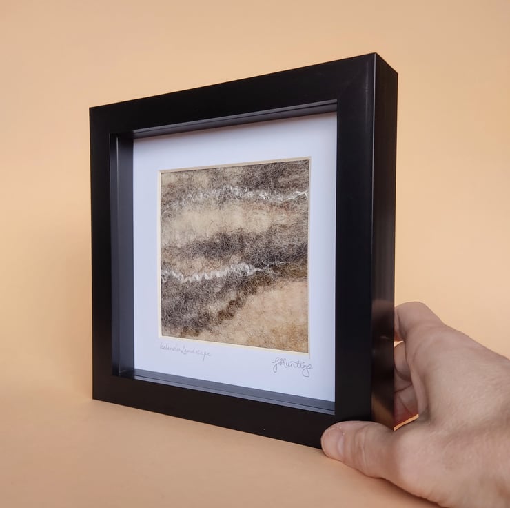 The piece is adhered to a white 6"x 6" mount with 4"x 4" aperture. It is then displayed in a 6" x 6" deep shadow box frame, to show off the textures of the work.