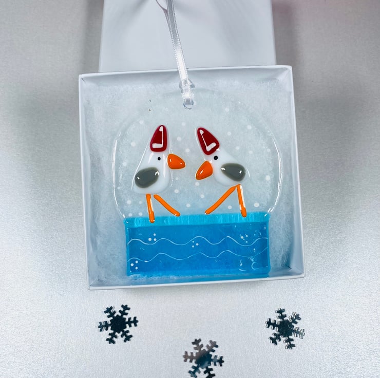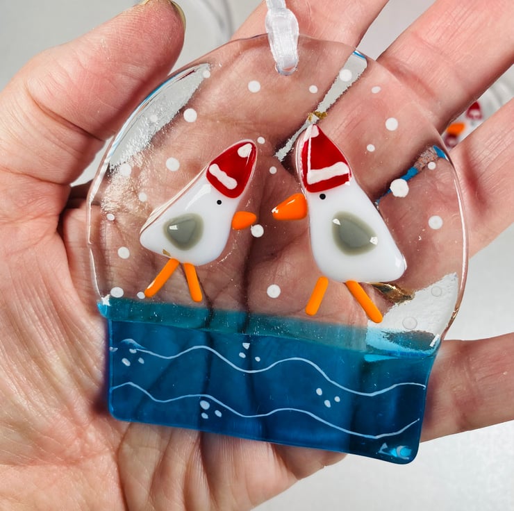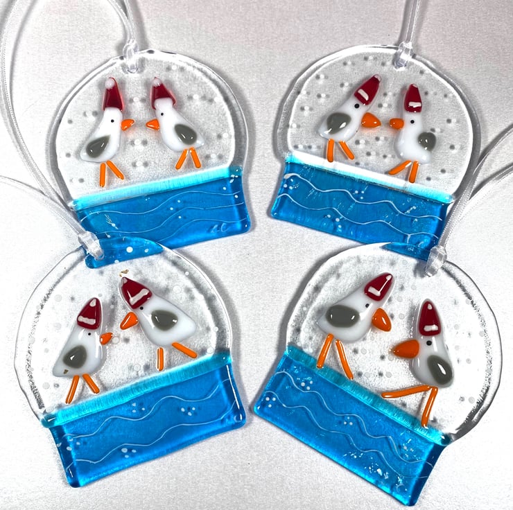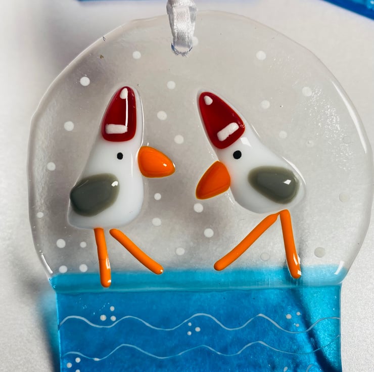 Cute seagulls are in my take of a Christmas snow globe. Lovingly all hand cut from sheets if glass and formed in my kiln . They are presented in a gift bag . They are approximately 4 inches diameter and are the perfect hanging for your tree. I find that people like to gift my hand made Christmas decorations as secret Santa’s or stocking filler.