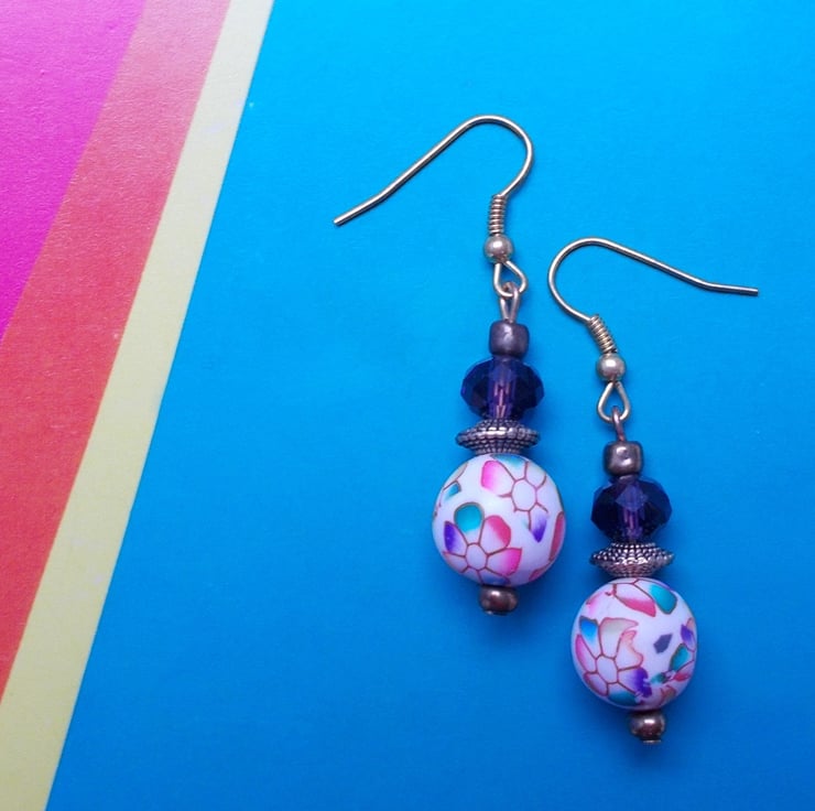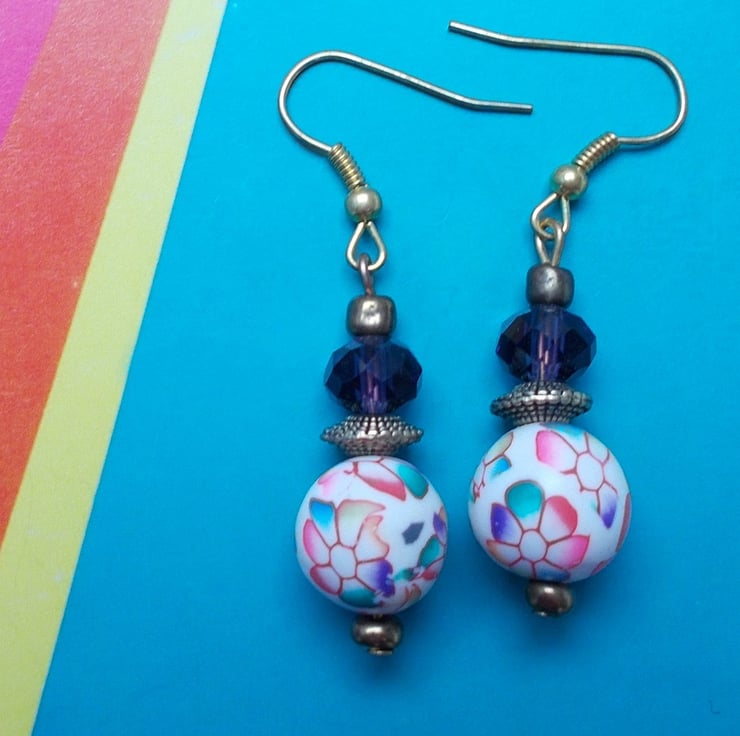 Lovely handmade beaded earrings made from a beautiful mixture of recycled beads in Tibetan silver, glass, polymer clay and crystal glass hanging on sterling silver nickel free hooks. Free UK postage.