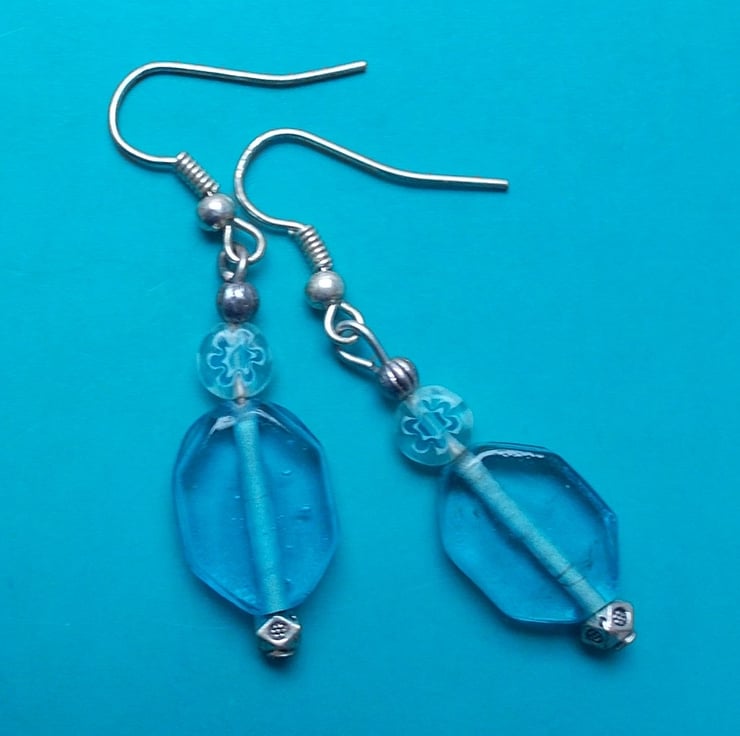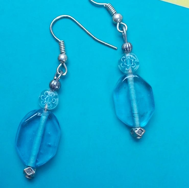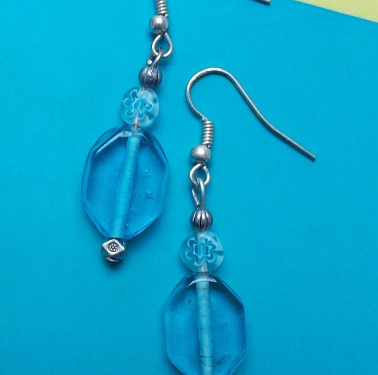 Gorgeous handmade earrings made from recycled blue beads which look so much like sweeties! But they are NOT so don't eat them! Hanging on sterling silver nickel free hooks, Free UK postage.