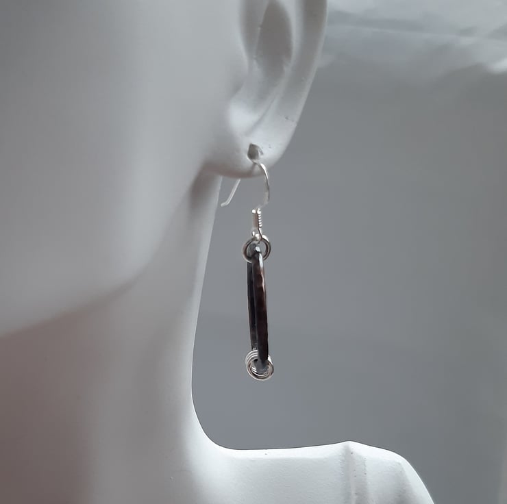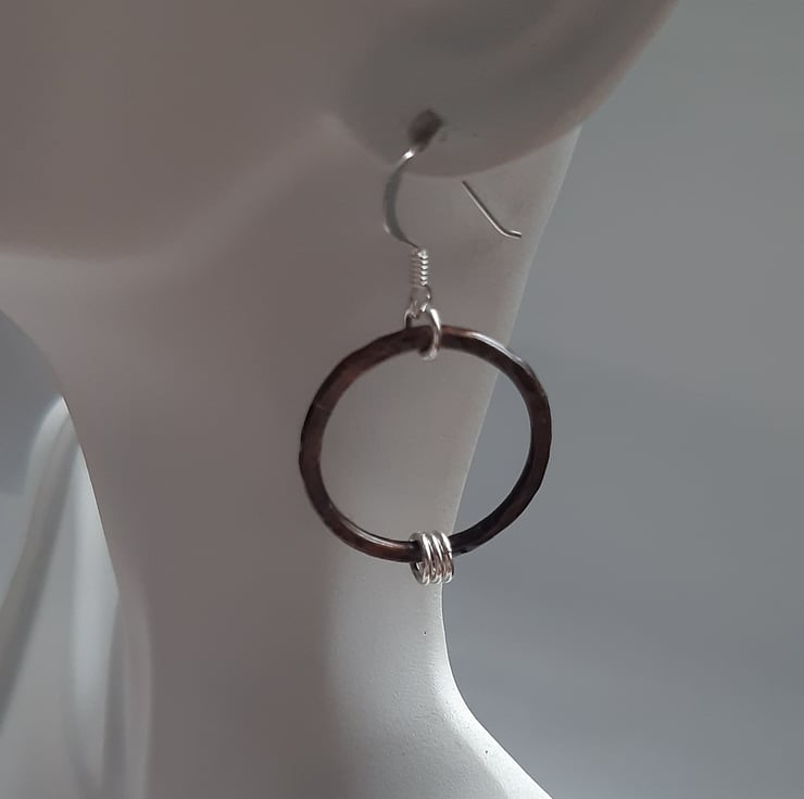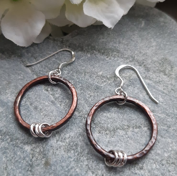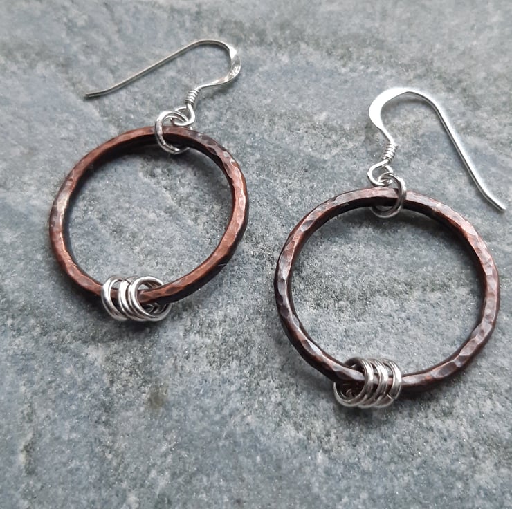 These earrings have been made out copper wire which has been formed into a circle soldered and hammered to give texture and harden the wire. The hoops have then been oxidised to give an aged look and then having a lacquer coating .The copper hoops have been attached to sterling silver ear wires. There are some small sterling silver jump rings added to the hoops All metals used are copper and sterling silver
