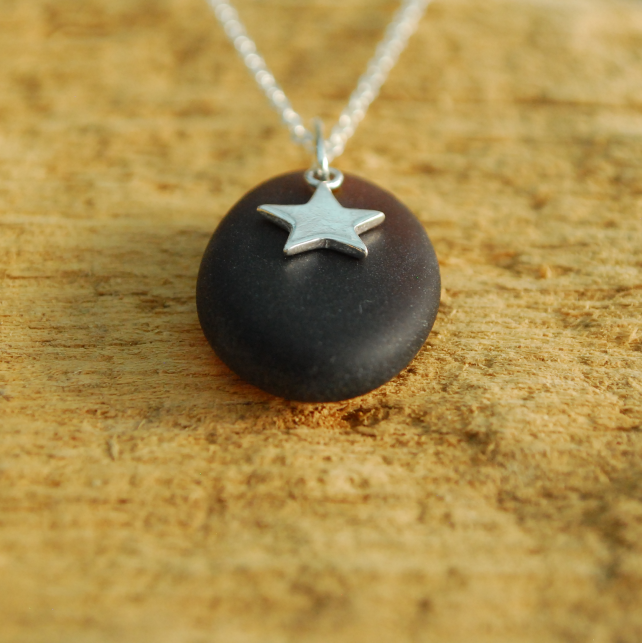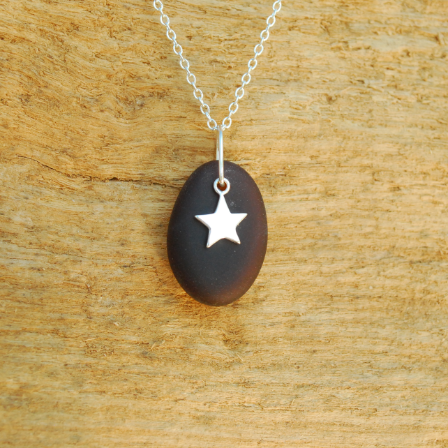We chose this piece of beach glass for its perfect shape. It is wonderfully thick and rounded, and we have tumbled it so it is finely frosted and feels silky. The little sterling silver star charm shines beautifully on the dark brown background.