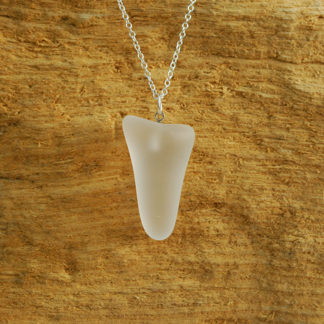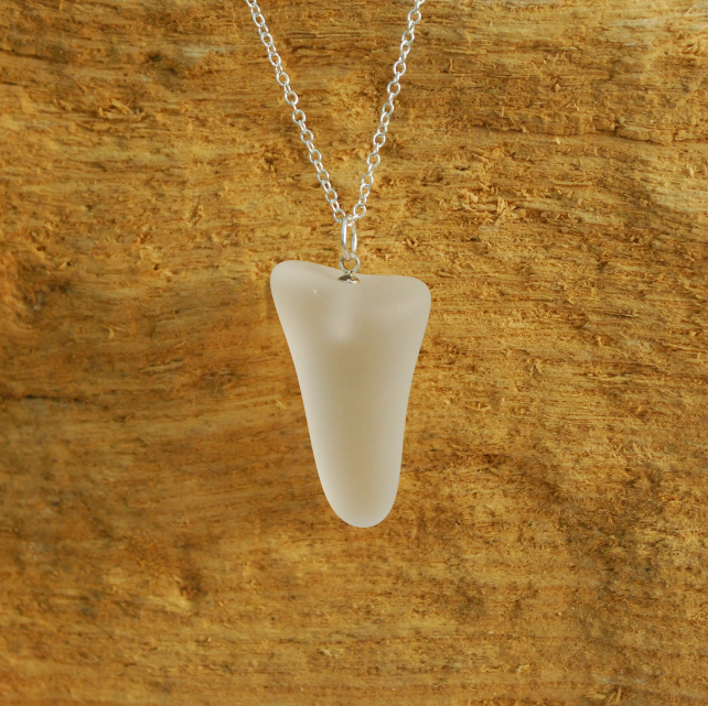 Beach glass comes in all shapes and sizes and this is a special one. It has come from the stem of a wine glass or similar item of domestic glass. It is a lovely bright white and we have tumbled it so it is silky to touch and finely frosted. The thickness of the piece and the frosting pick up the light beautifully. We have kept this eye-catching pendant simple by mounting it using a sterling silver peg bail. This gorgeous pendant looks wonderful against all colour backgrounds.