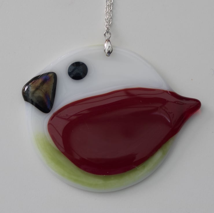 He is constructed from a circle of white glass as the main body, over which we position a specially cut piece of glass to make the wing. We sprinkle powdered glass to make his coloured breast and add small pieces of glass for his beak and eye and pop him in the kiln for 12 hours. Once he's cooled down, we drill a hole, add a bail and string the chain.