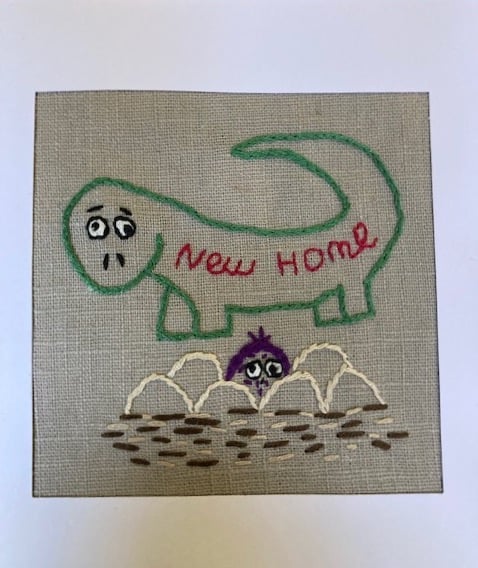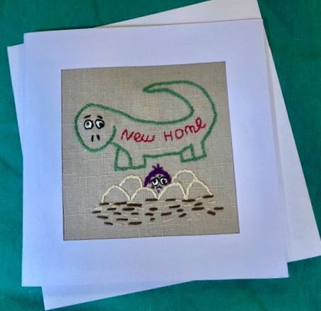 This cute dinosaur is blissfully unaware of the little intruder making its new home in her carefully laid eggs. The little creature is a naughty bogle who has escaped from his natural habitat (your sock drawer) and found his way into a new home. The dinosaur and her new addition have been hand embroidered onto natural linen and mounted in a white aperture greetings card (144mm x 144mm). The inside of the card has been left blank for your own message.