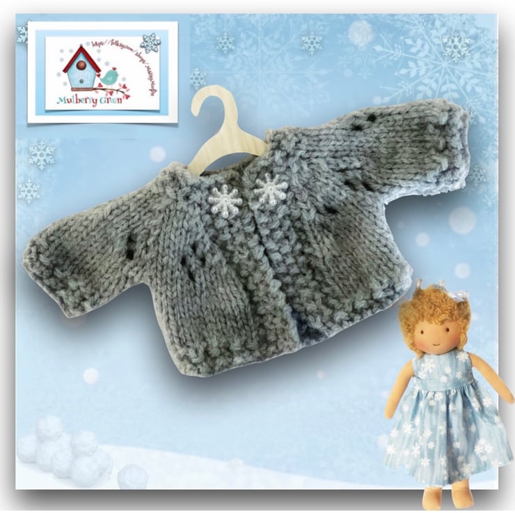 A really pretty little cardigan decorated with two little pearl snowflakes, made especially to fit the Mulberry Green dolls. The cardigan has a lace pattern on the yoke.
