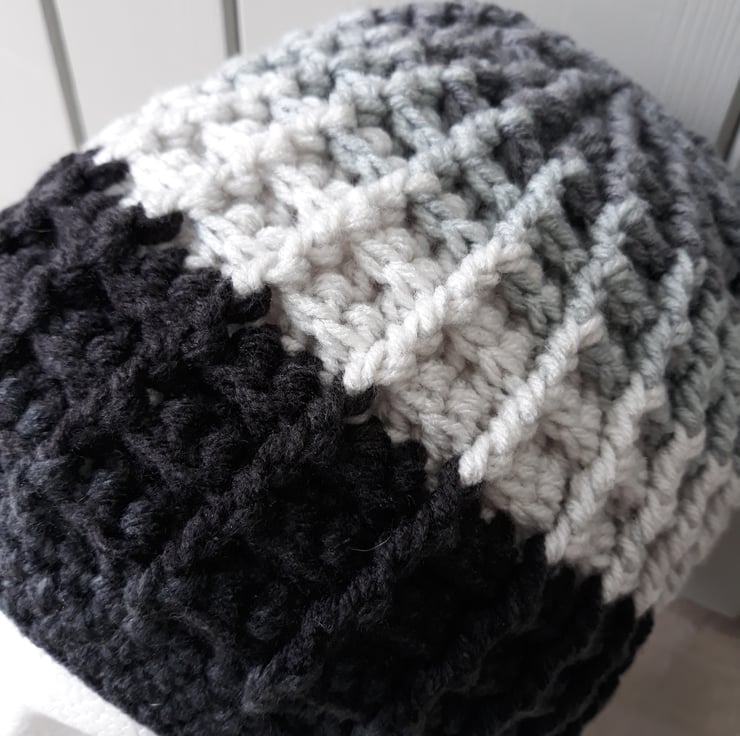 Chunky hand crochet hat in Black and greys
