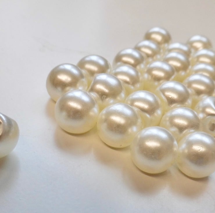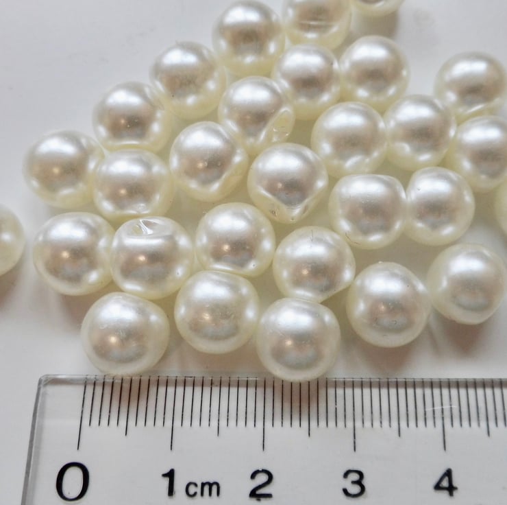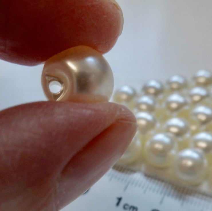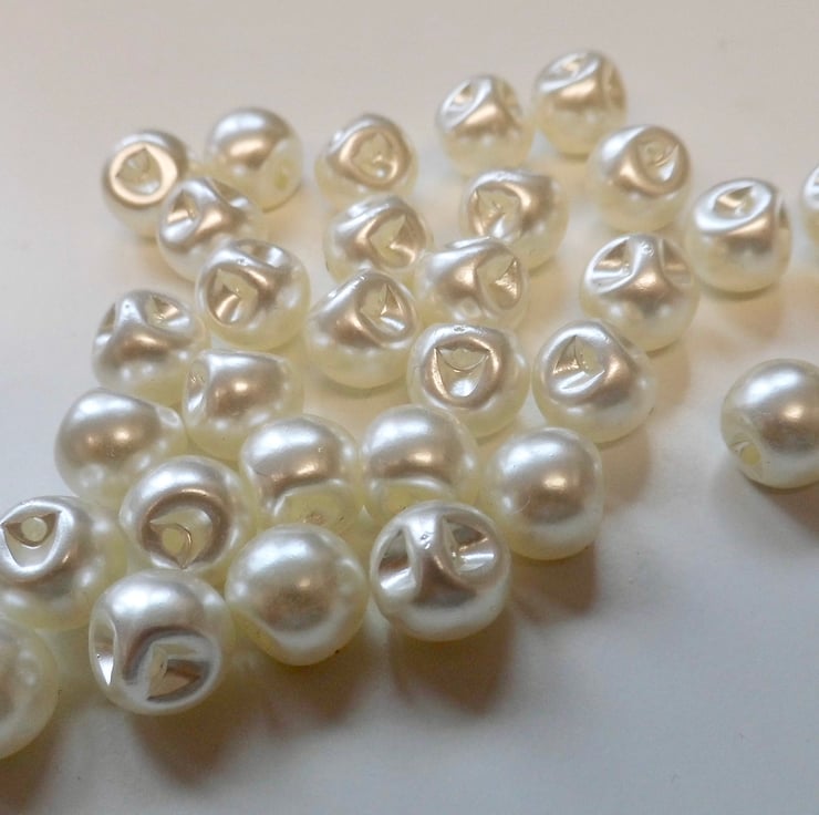 Shaped like little balls, with a diameter of about 10mm.The single hole does not go through the centre like a bead, it is to one side, making these useful as buttons, please see photos.