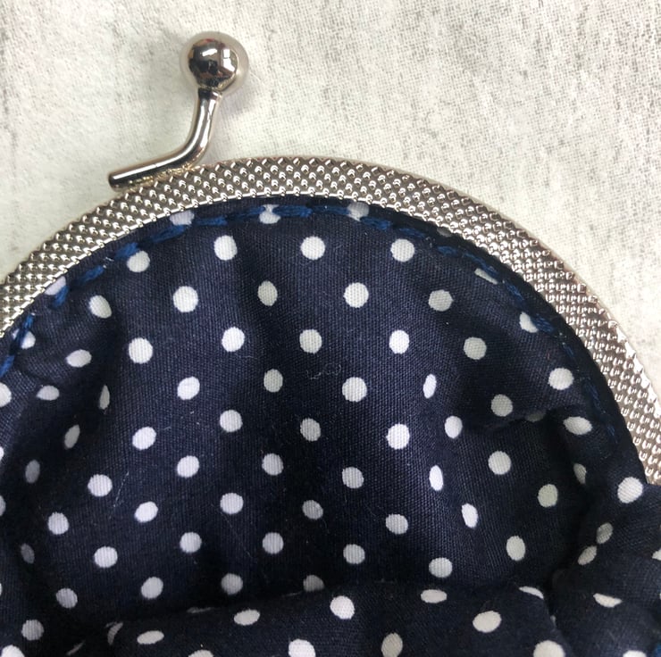 The silver embossed metal clasp is attached to the purse with a navy embroidery thread.
