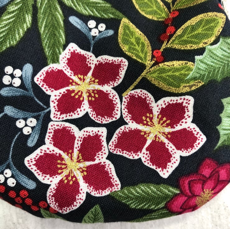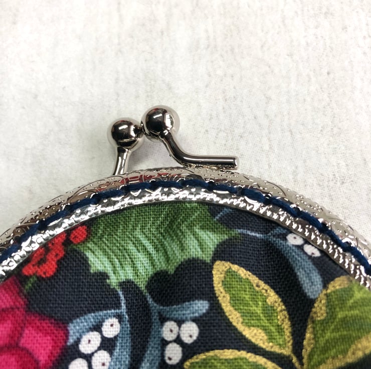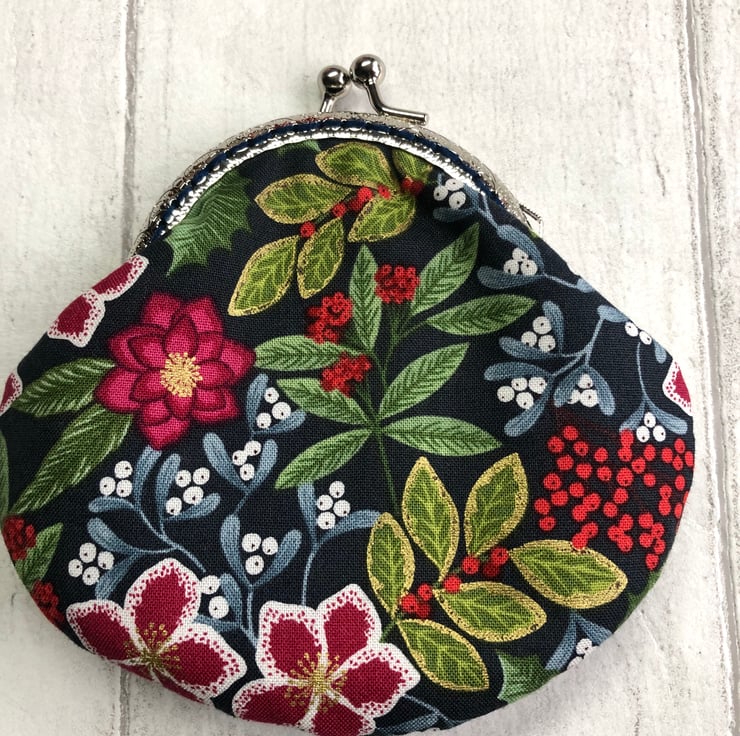 This delightful clasp coin purse is made from a cotton fabric with a navy background and a design of poinsettias, holly and mistletoe leaves and berries in shades of green, white gold and red.