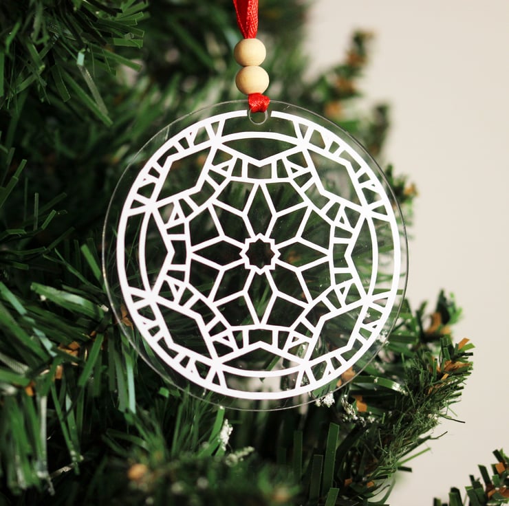 Clear acrylic disk with a machine cut stick on vinyl adornment in white.