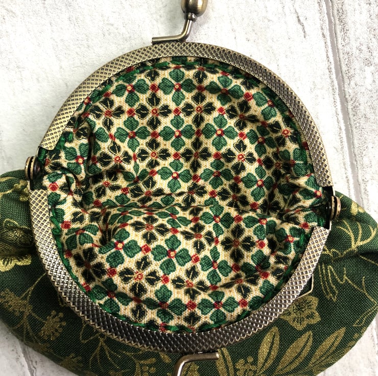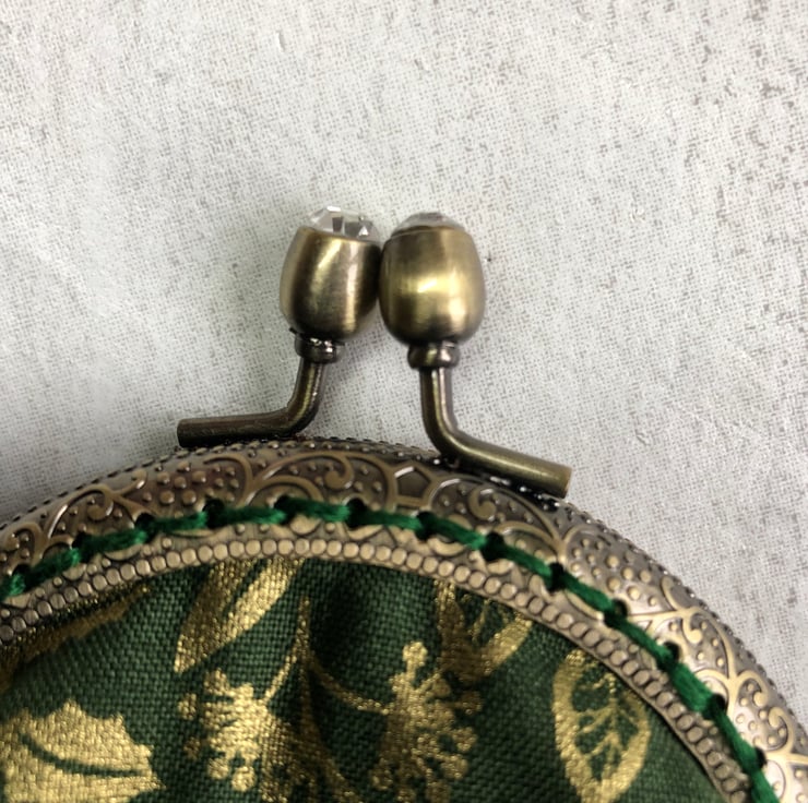 The antique bronze embossed metal clasp frame is attached to the purse with a dark green embroidery thread.