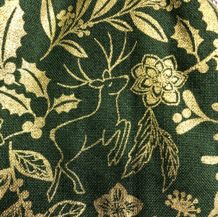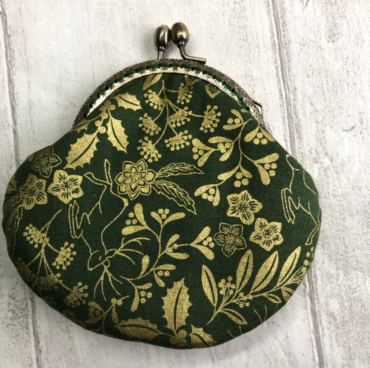 This clasp coin purse is made from a dark green cotton fabric with a design of festive florals and a stag in gold.