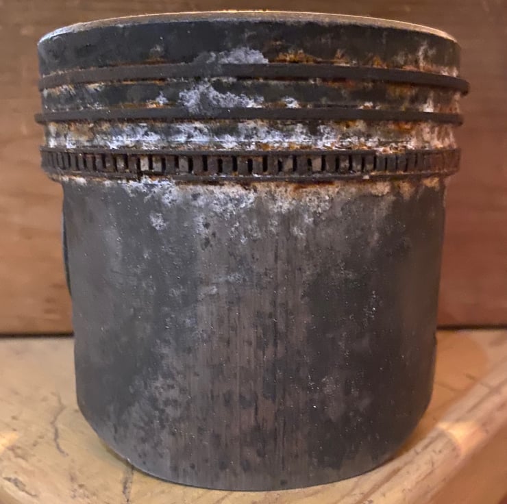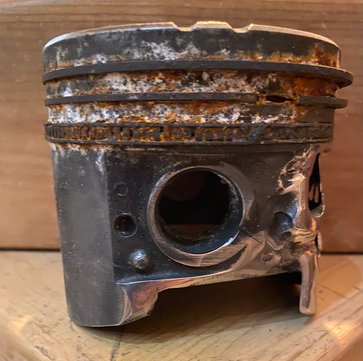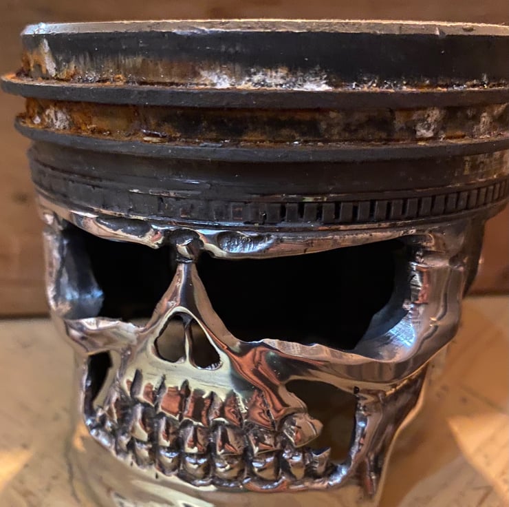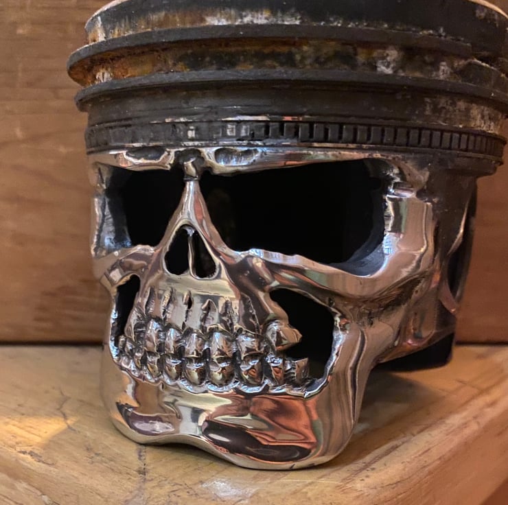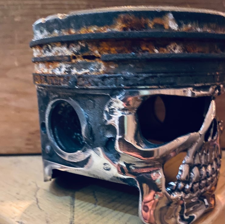 This is a used and damaged original Chevy piston that has been carefully carved and polished in to a piston skull face!
