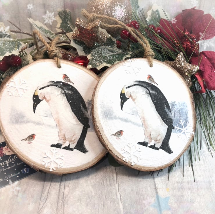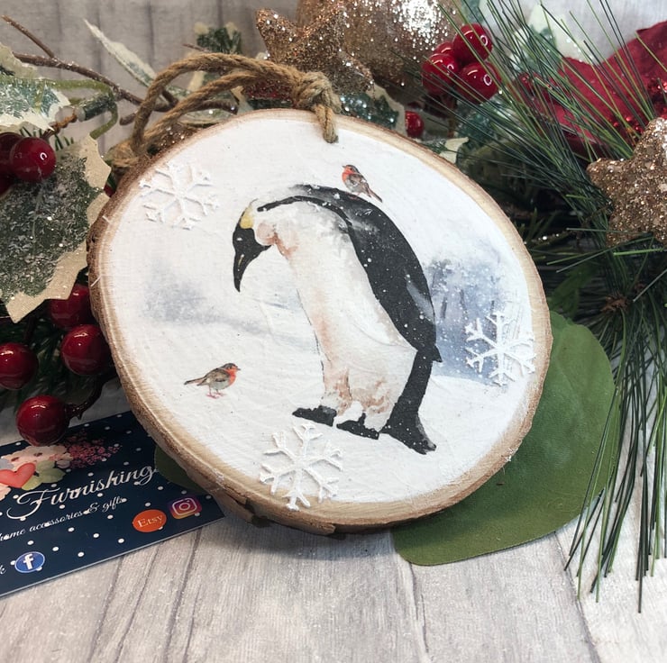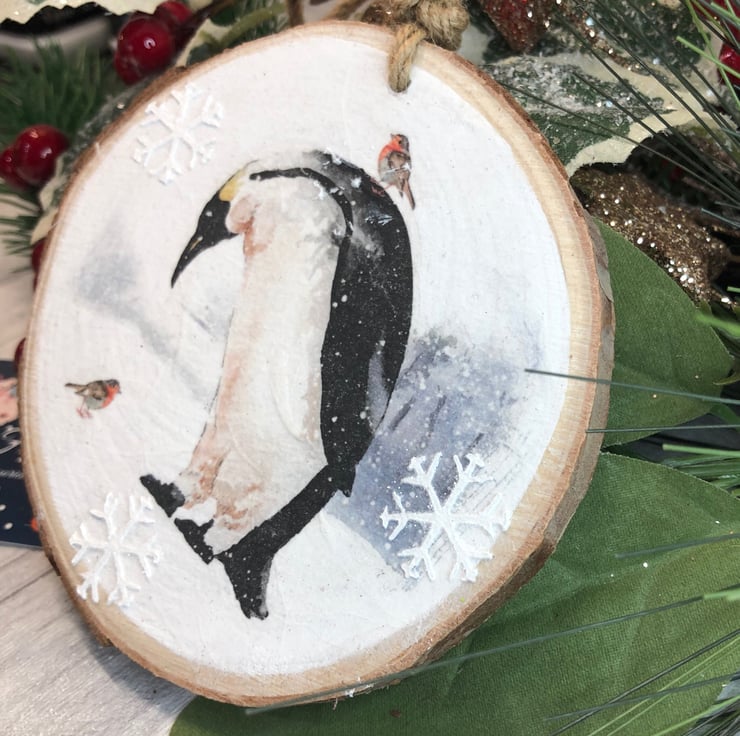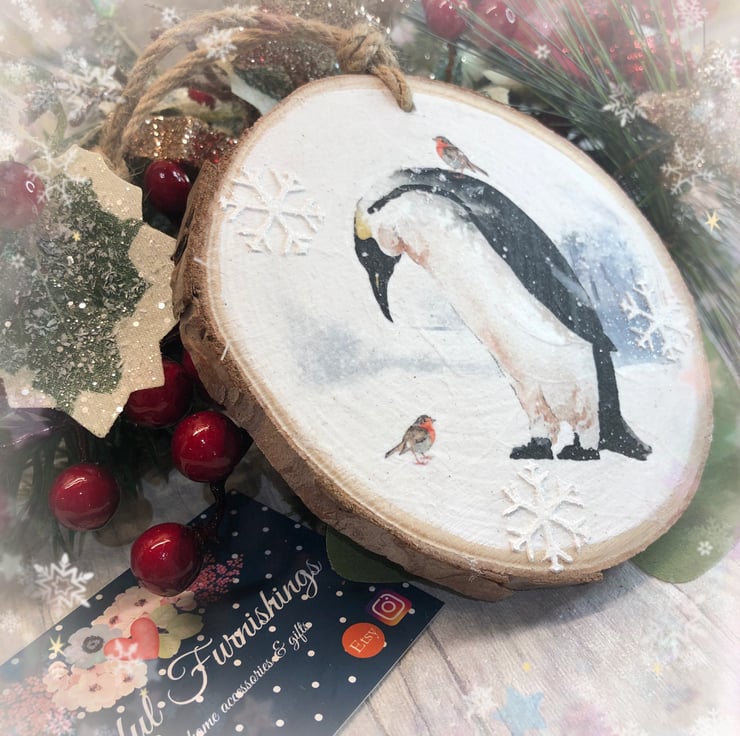 Beautiful image of a penguin having a conversation with a Robin! The image has has been carefully decoupaged on to a natural wood slice to create a rustic feel. It measures approximately 10cm and is hung from chunky twine. I’ve also added some snowflakes using texture paste and hint of glitter to create a little sparkle! Perfect to hang on your tree or anywhere you fancy!