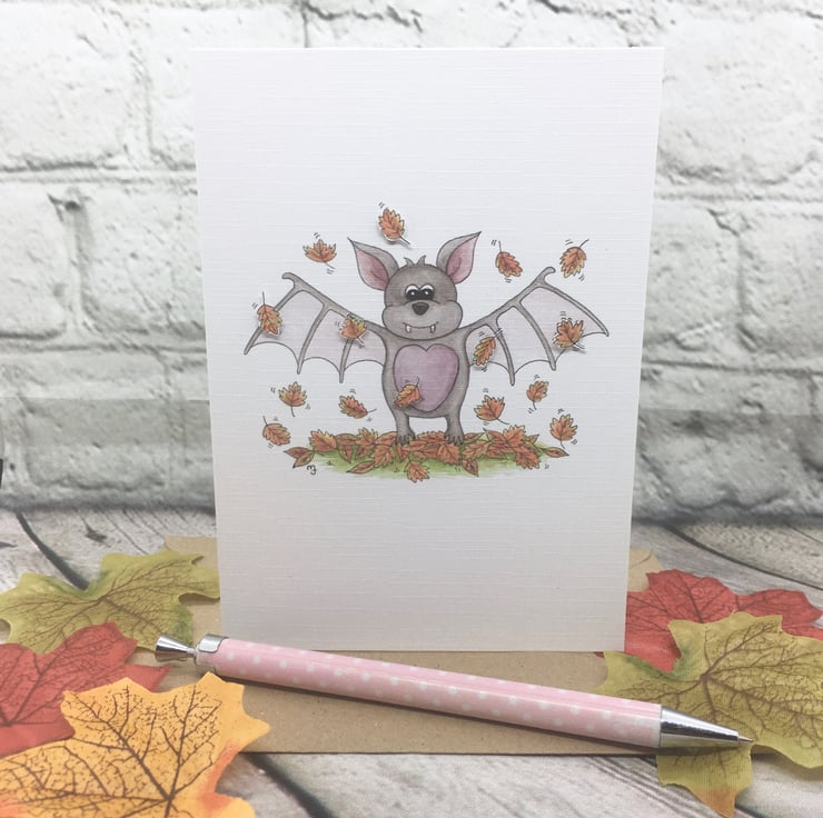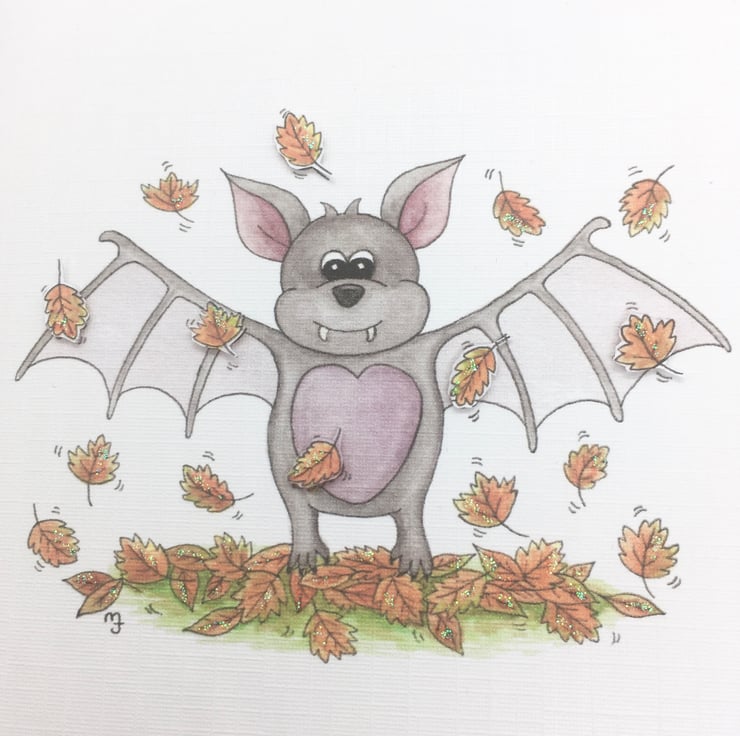 This cute Bat playing in the Autumn Leaves card has been designed using my own original illustration. The image has been printed out onto good quality white linen embossed card and decoupaged up in parts. I have also added a little glitter detail.