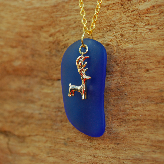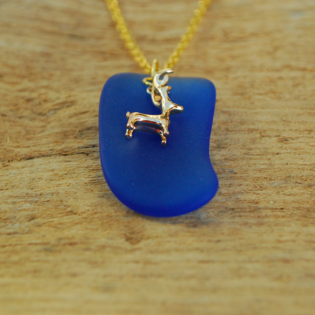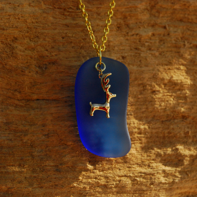 The glass we've used to make this unusual pendant has come from an old poison or medicine bottle. It's a beautiful blue and curves perfectly behind the tiny gold plated deer charm. The charm is wonderfully detailed and shines fabulously against the dark glass. We've tumbled the beach glass so it is rounded and feels silky.
