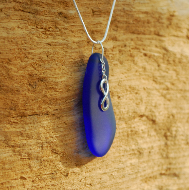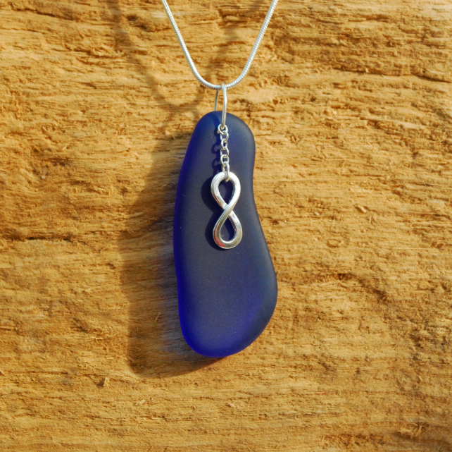 Great care goes into pairing our beach glass with our charms. This is a fabulous combination of a sterling silver infinity charm and a beautiful piece of tumbled beach glass. The glass has come from an old medicine or poison bottle. It is unusually thick so we think the bottle was large. The glass curves gently behind the charm and its dark colour sets off the shining silver. All the metal in this pendant is sterling silver.