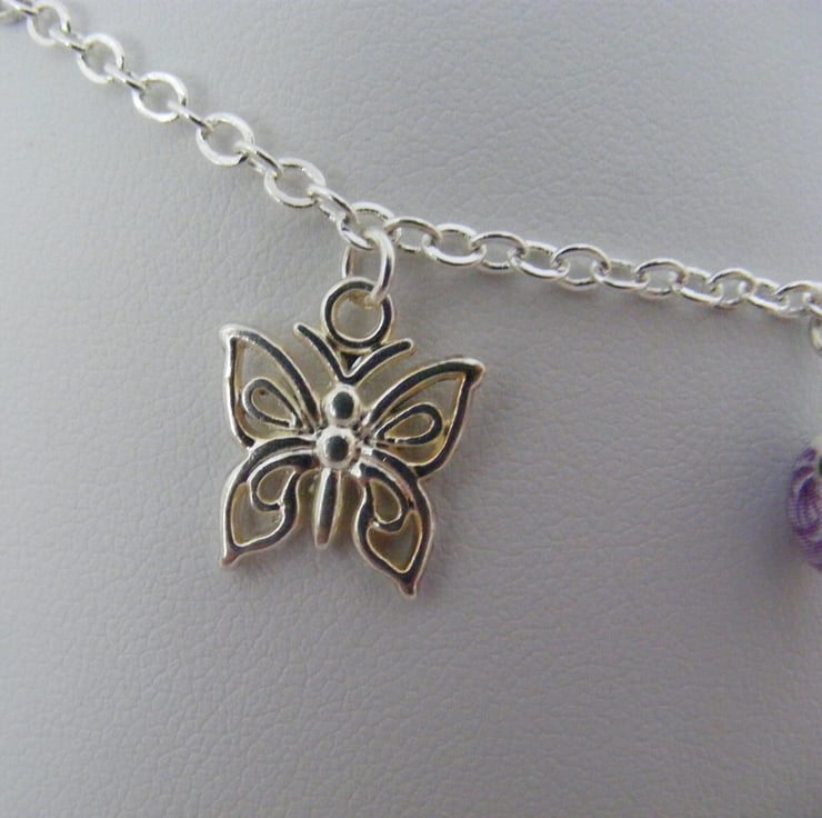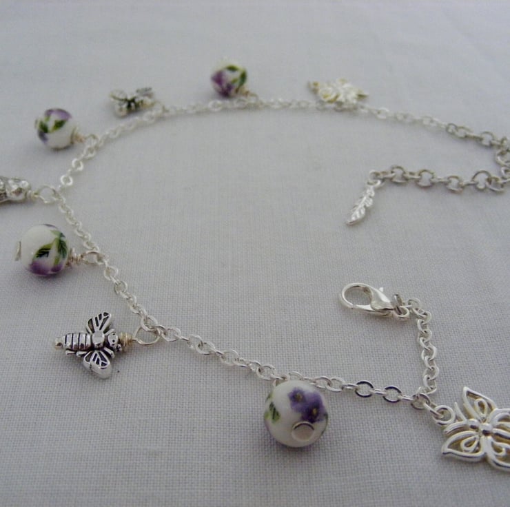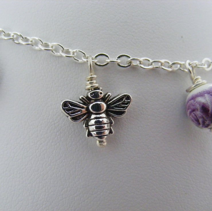 Anklet is handmade with, 8 mm purple rose ceramic beads, 15 x 8 mm silver plated owl charm, 14 x 10 mm silver plated bee charm, 14 x 13 mm silver plated butterfly charm,