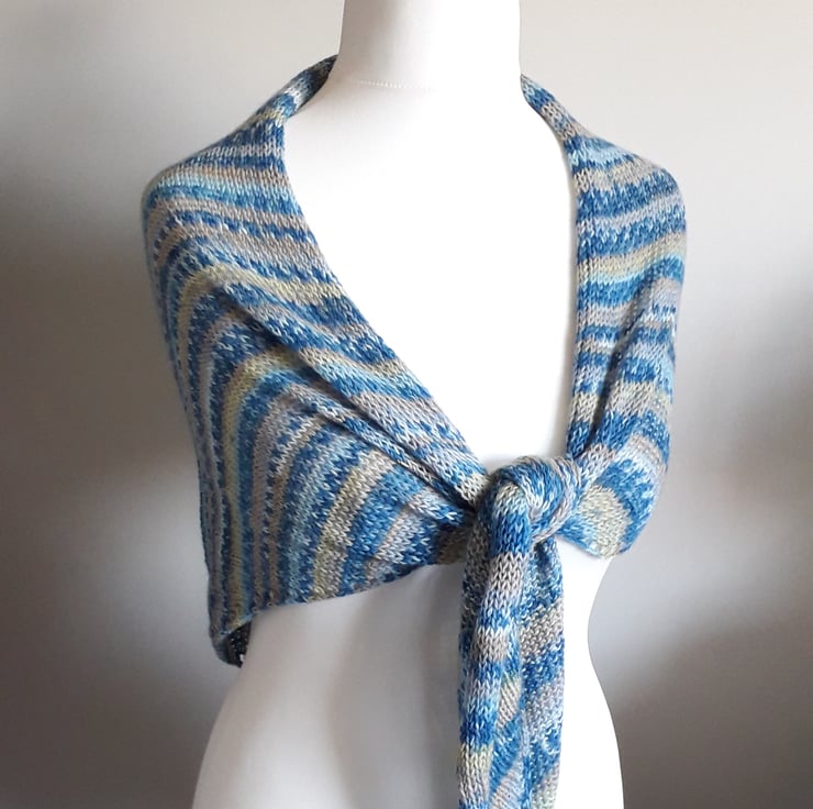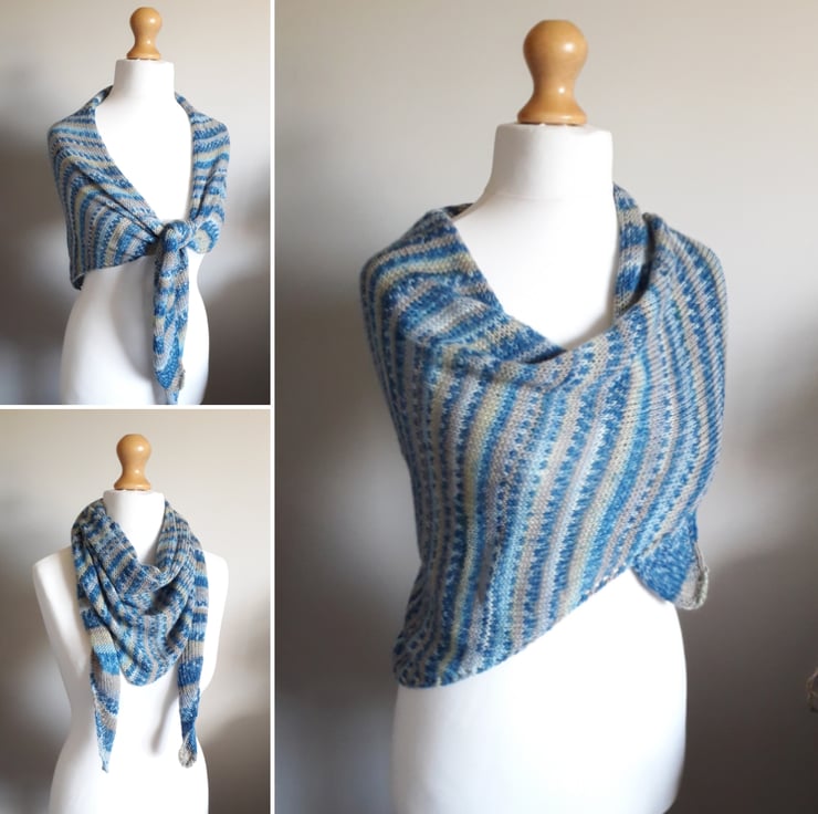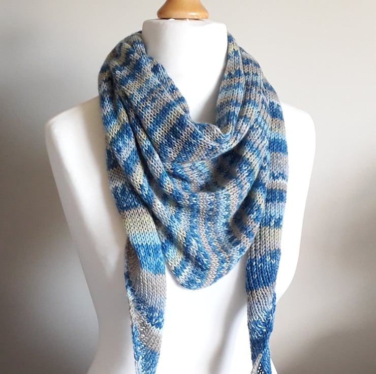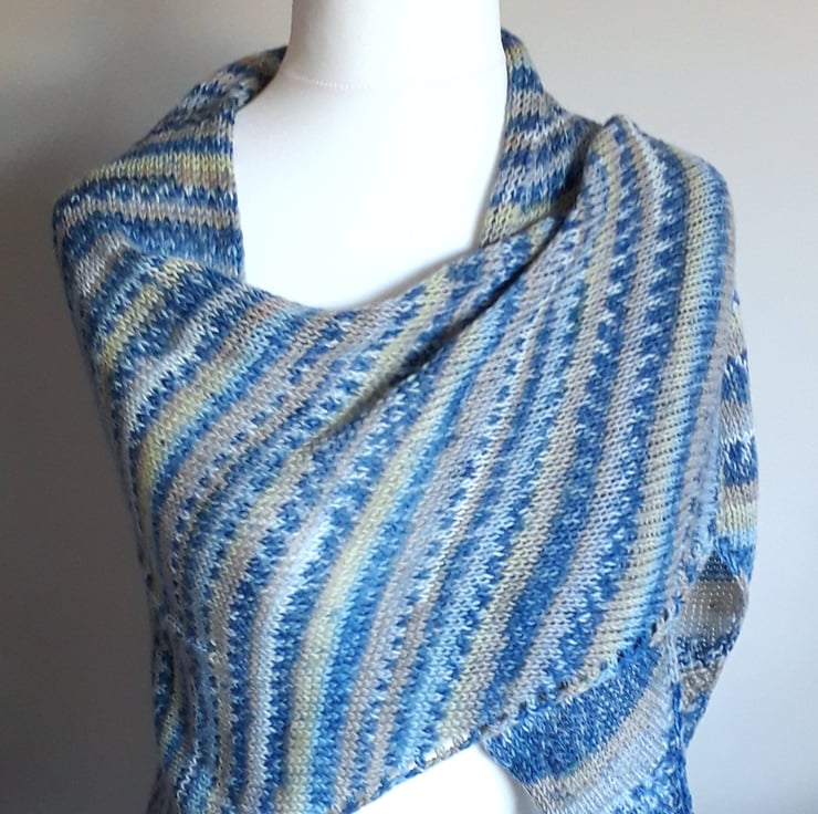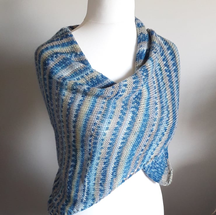This triangular wrap has been lovingly knitted on a hand operated knitting machine in various shades of blue, creating a beautiful patterned effect. It will make a much loved addition to your wardrobe or a wonderful gift.