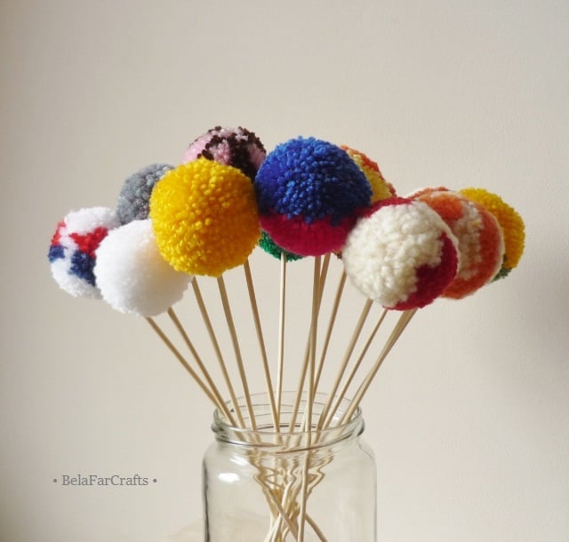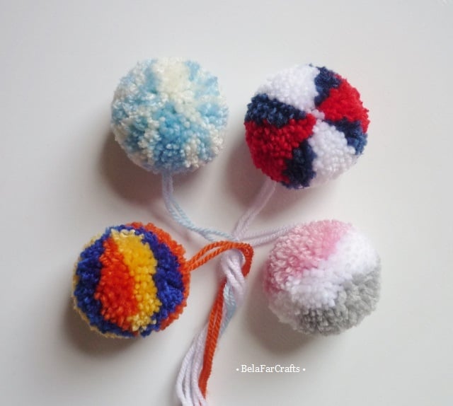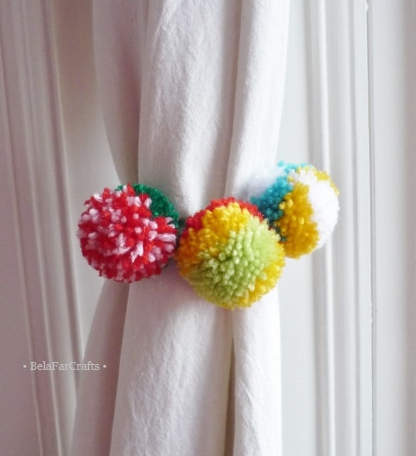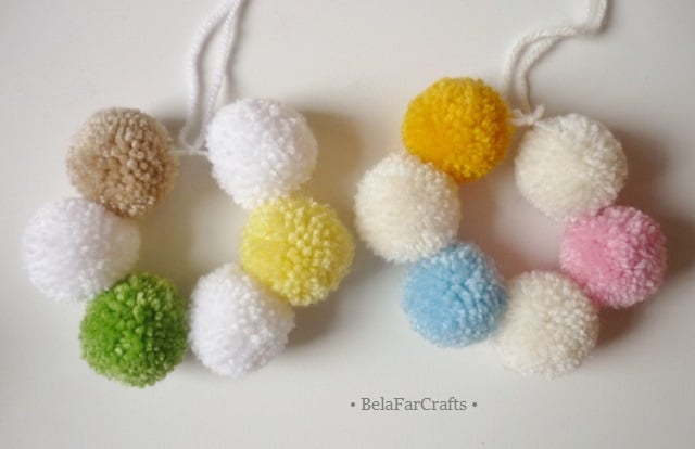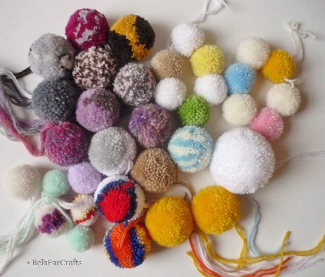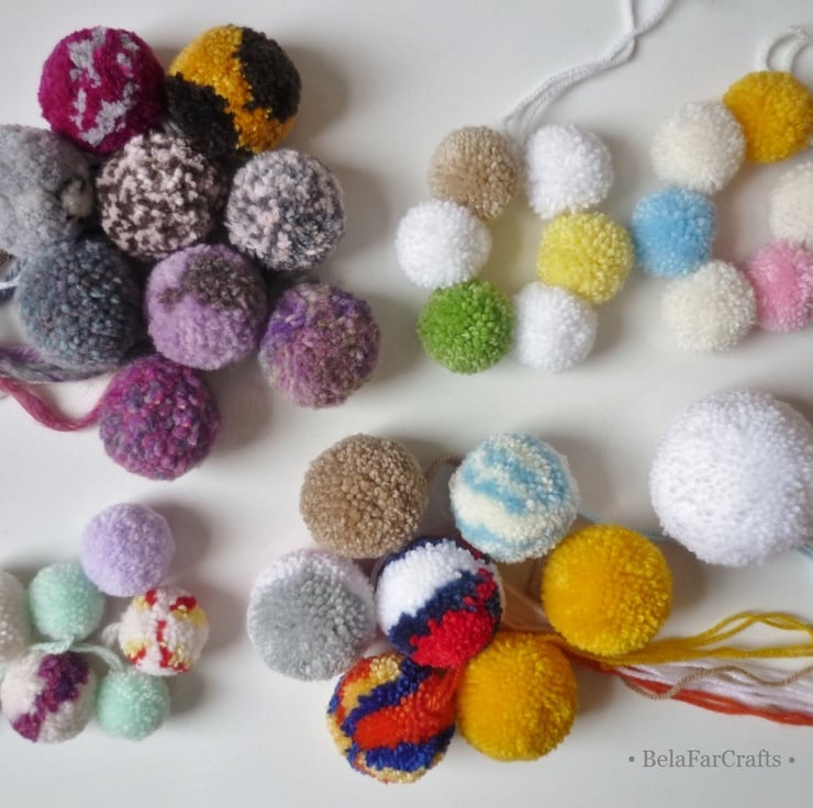 The pom poms come with some yarn attached so you can easily hang them or add them to hats, scarves, blankets, cushions and gift boxes. You can also create a garland or wreath to decorate your living space and a baby's crib.