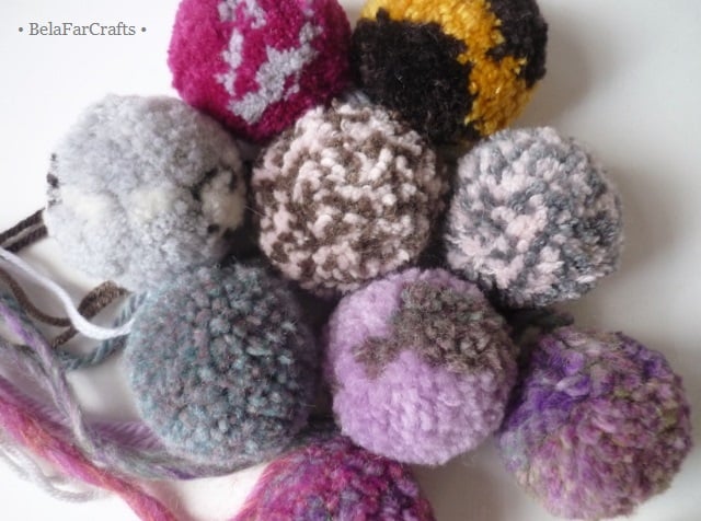 I created this set of soft pom poms with oddments of various types of yarns and colours. They are 23 measuring 2.5cm (1in) - 6.5cm (2.5in) wide and 2 hanging ornaments with 6 pom poms each measuring 3.5cm (1.5in) wide.