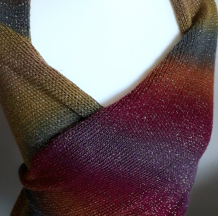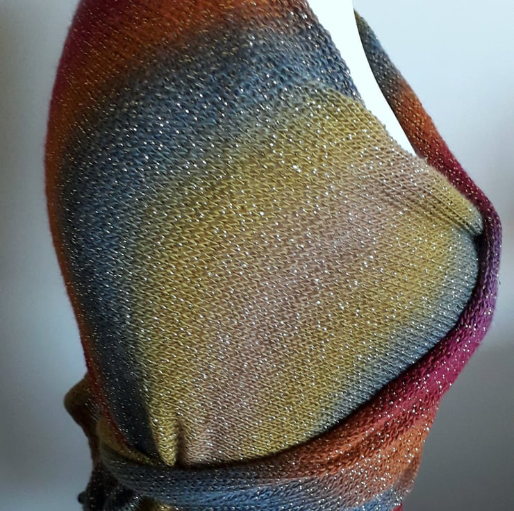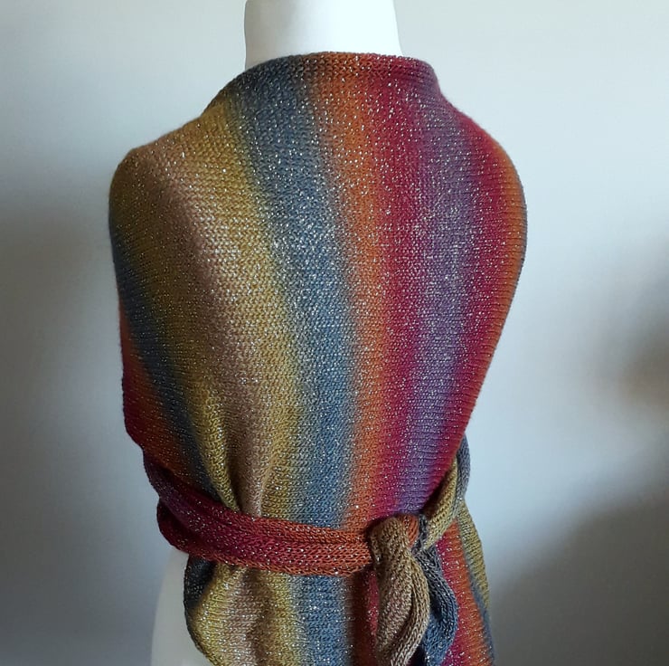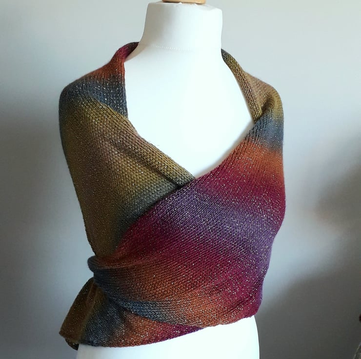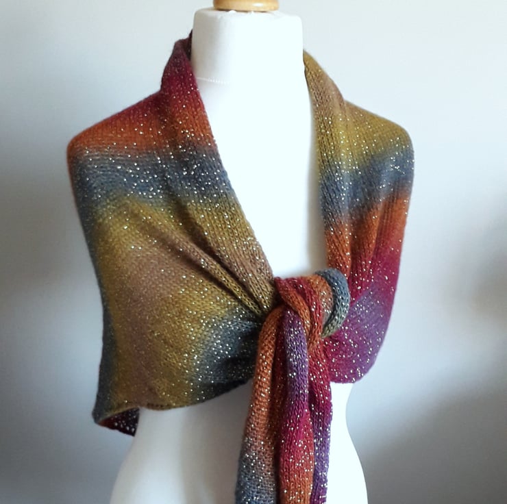 This triangular knitted wrap features a beautiful array of colours accompanied by gold sparkles representing the stars. It also has pretty eyelets along two sides for a decorative finish.