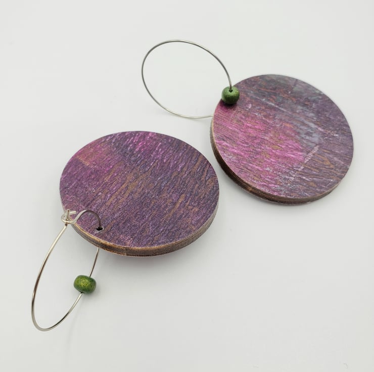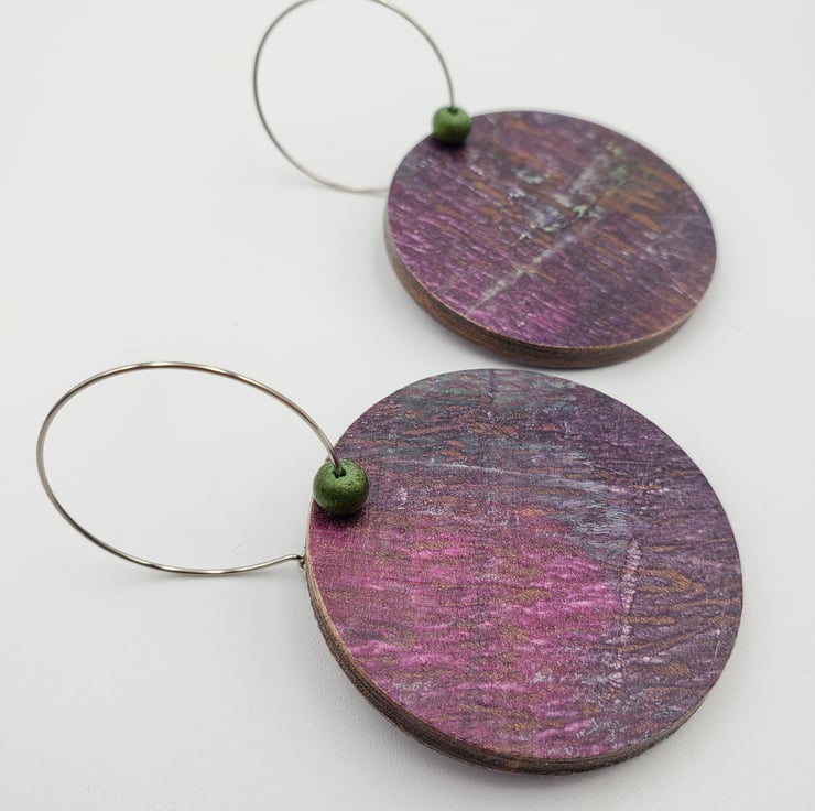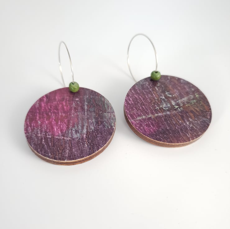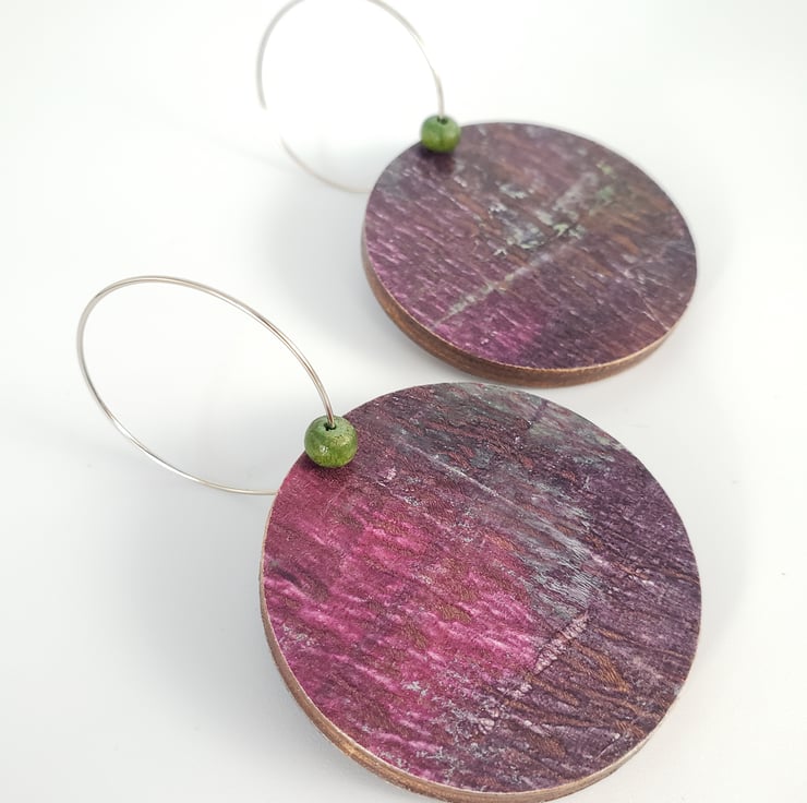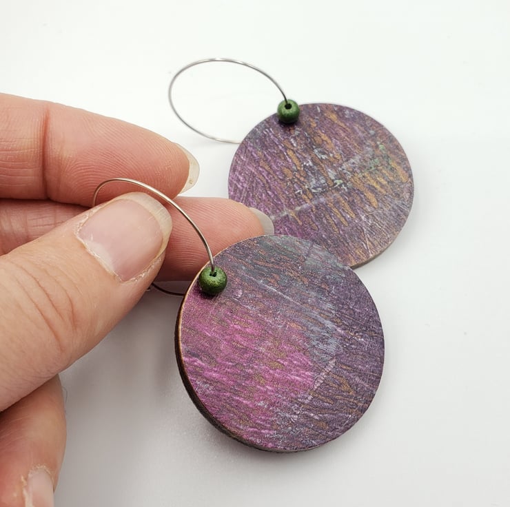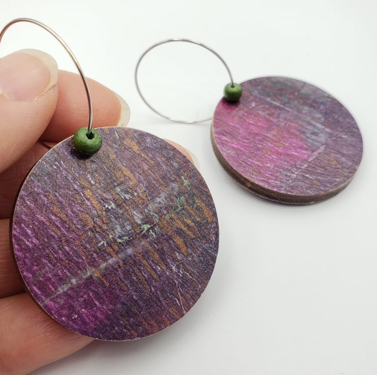 These hoop drop earrings are mainly purple and pink in colour with copper and grey running through the abstract print. I added a tiny olive bead to finish them off.