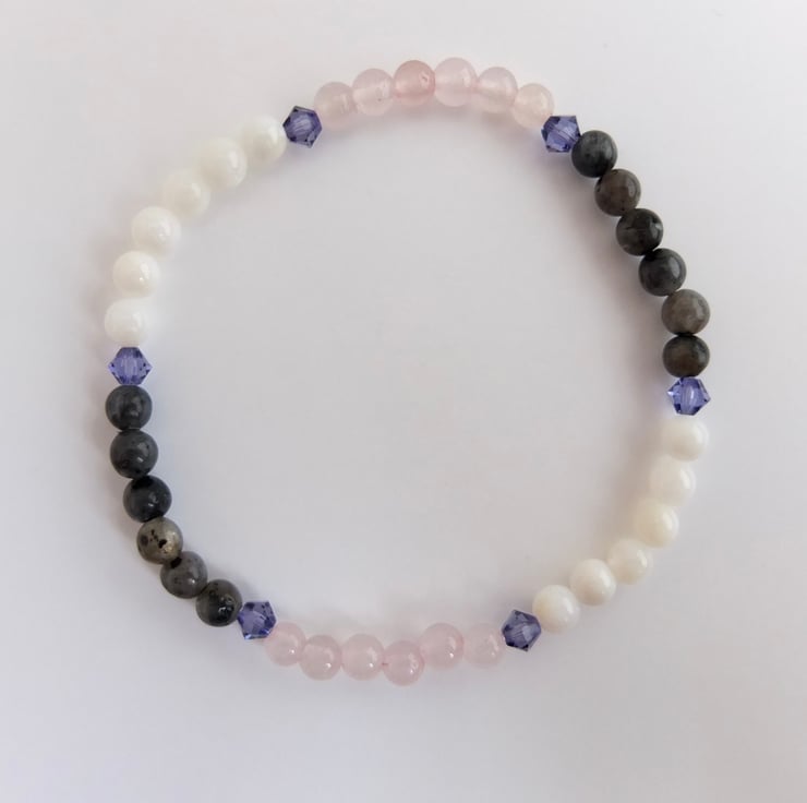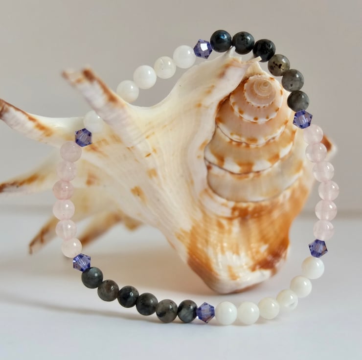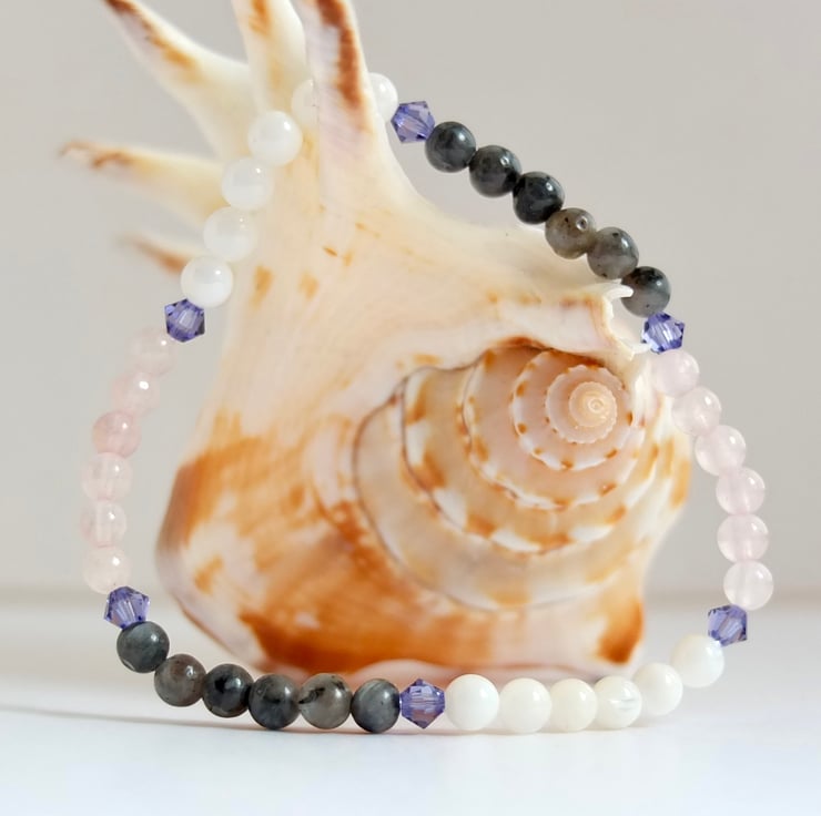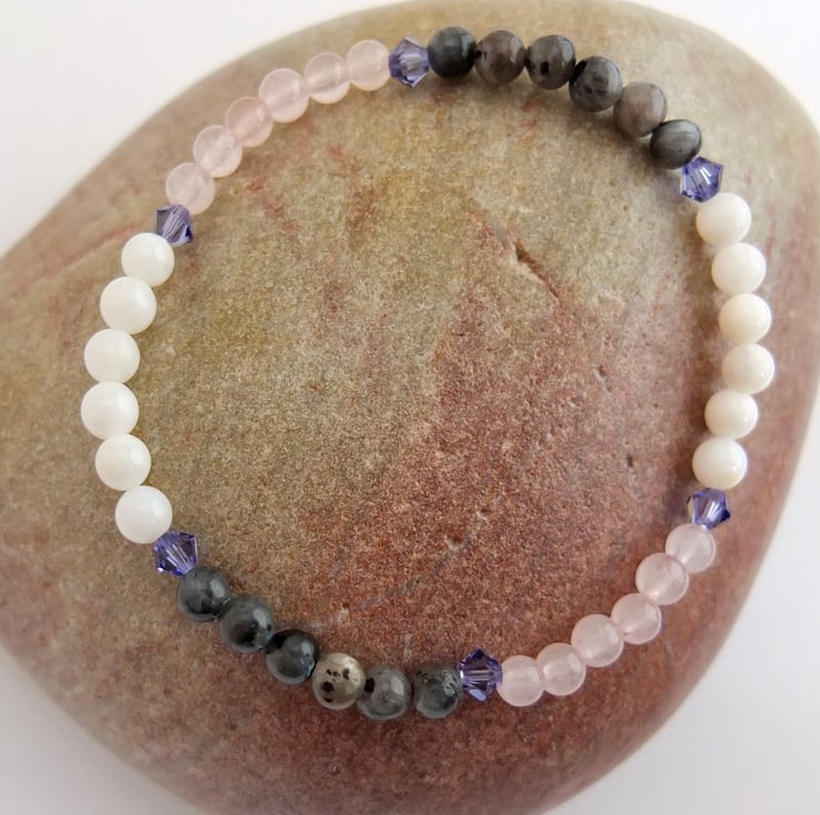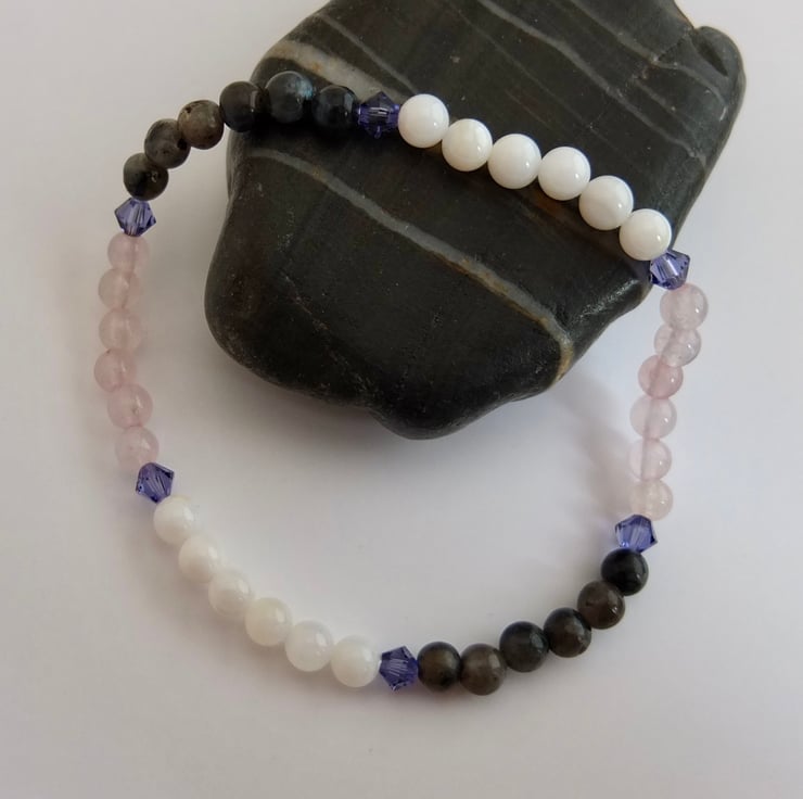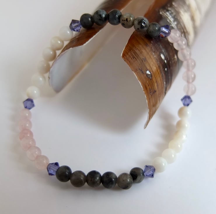 Beads of labradorite, rose quartz and white shell are separated by sparkly Swarovski crystals in a colour called "tanzanite"