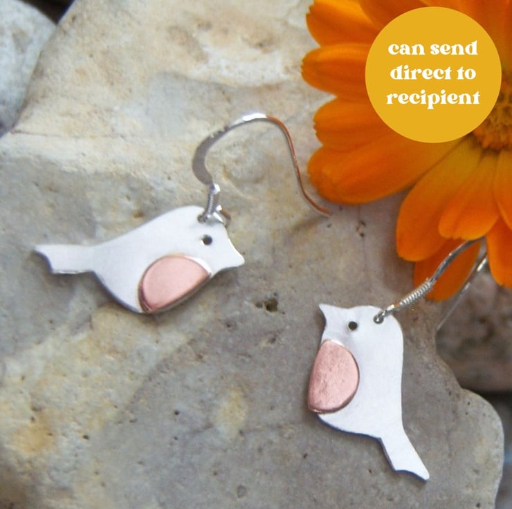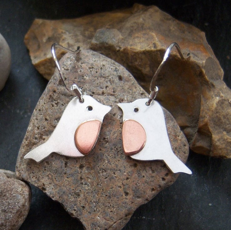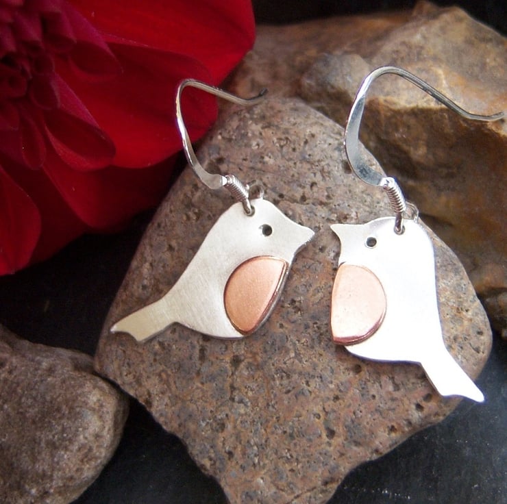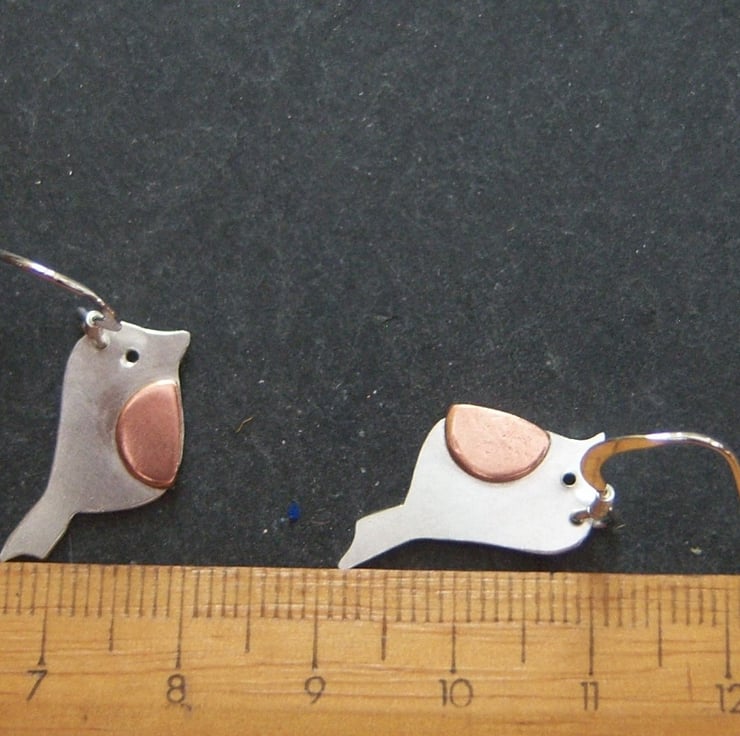 Robin earrings cut from sterling silver sheet and copper soldered on to make the robin's redbreast. 2.3cms from tip of beak to end of tail. Sterling silver earwires.