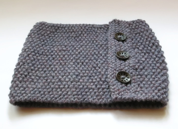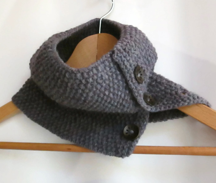 This ladies Aran wool cowl neck warmer is great for keeping that winter and Spring chill off. It's made in a lovely soft purple heather Aran wool (25% wool) and fastens with 3 chocolate brown wooden buttons. It's hand knitted in a moss stitch pattern.