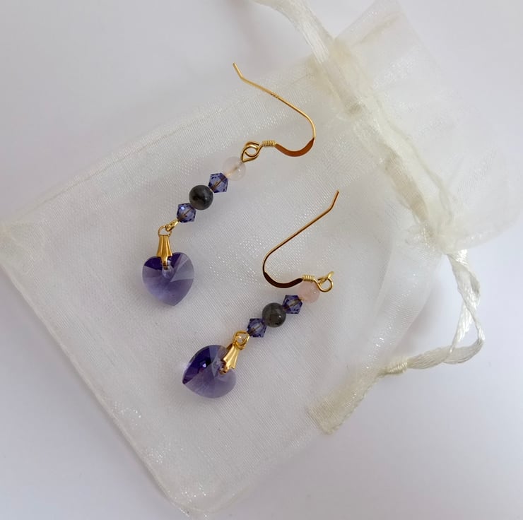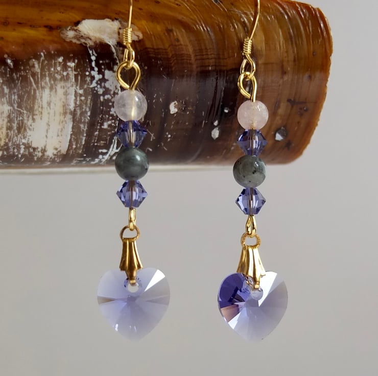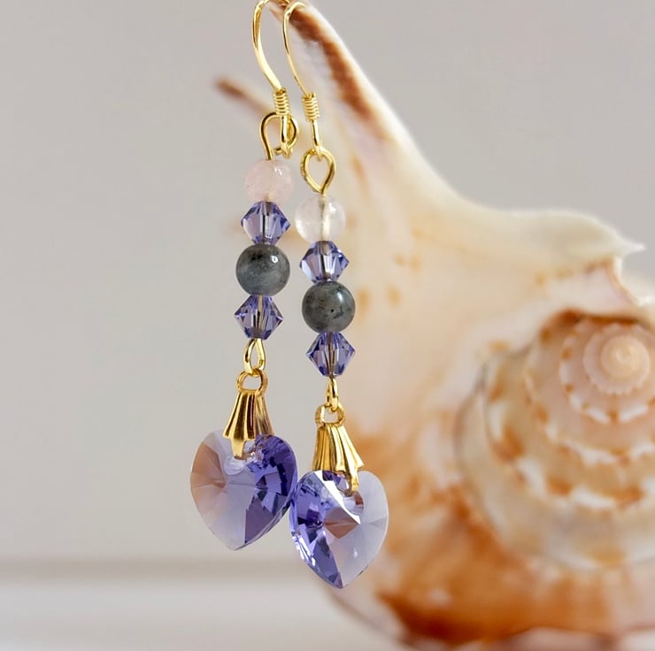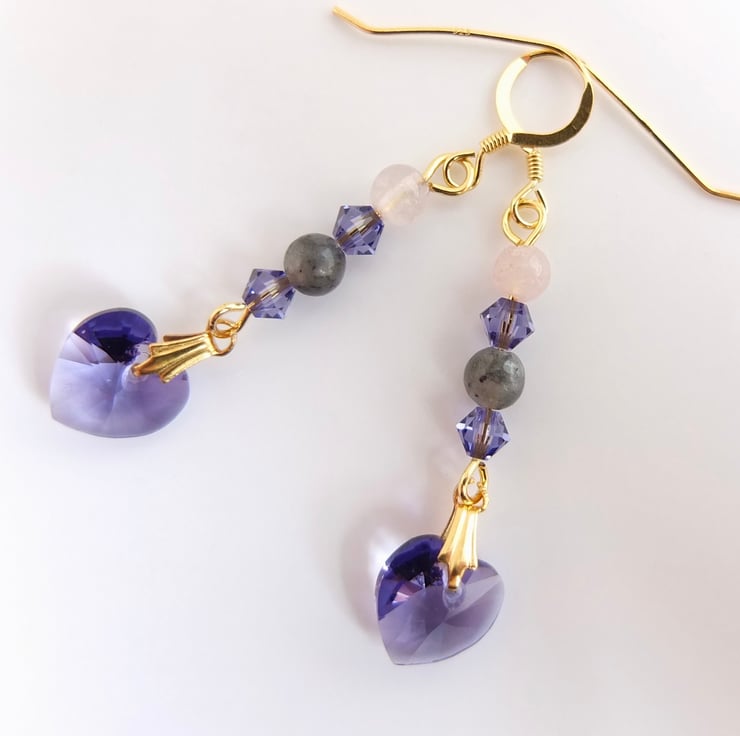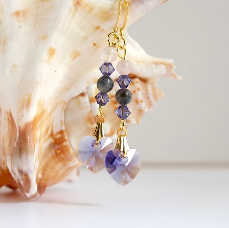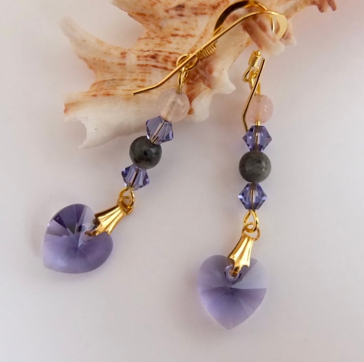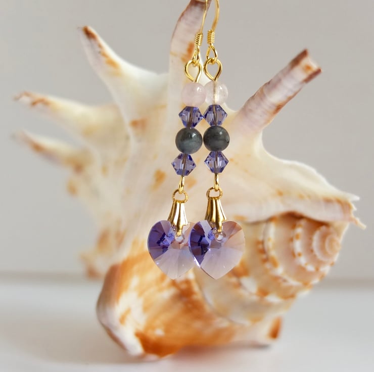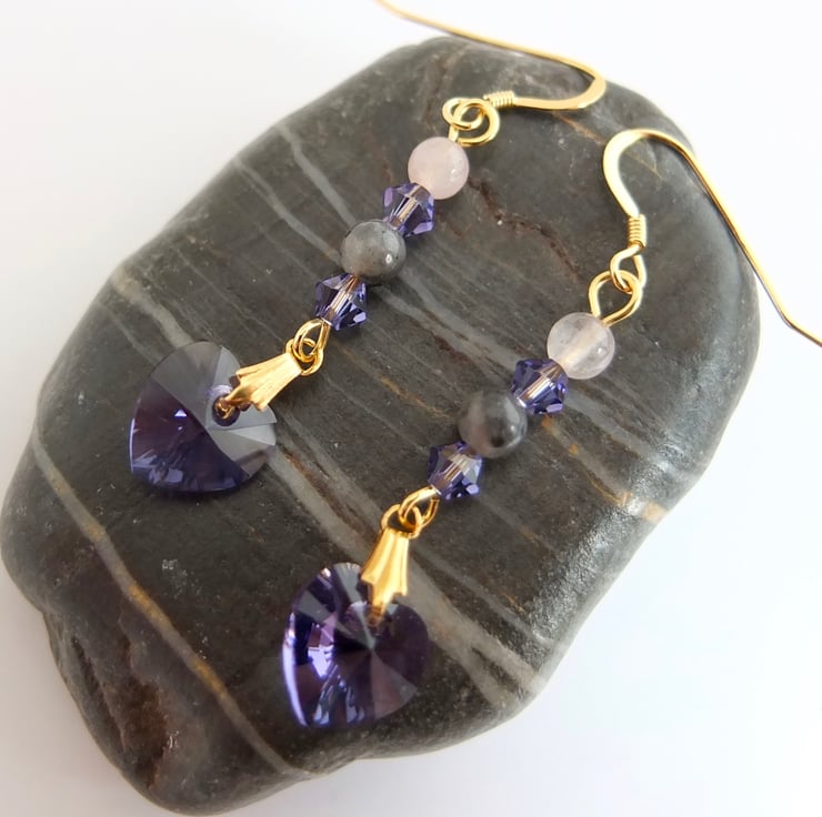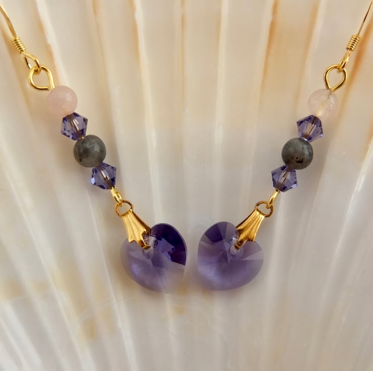 Each 10mm shimmering purple Swarovski heart is topped with two matching "tanzanite" Swarovski crystal bicones, a 4mm labradorite and a 4mm rose quartz bead.