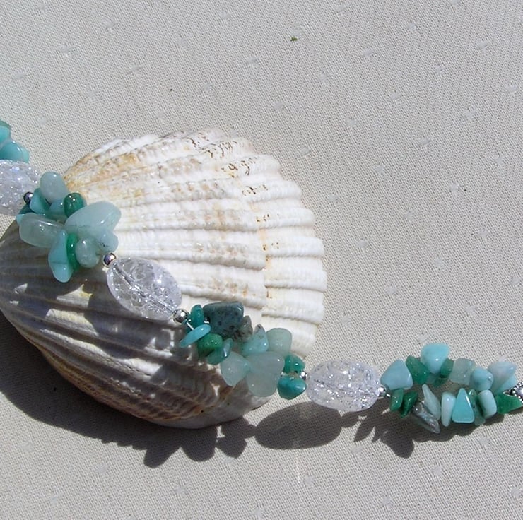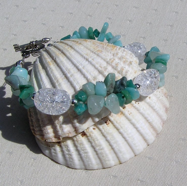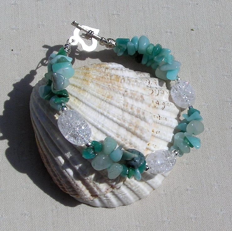 This Stunning Bracelet is made from three Chunky Crackled Quartz Nuggets separated by double-stranded pale green Amazonite Gem Chips along with tiny Silver spacers - a Beautiful glistening combination that will look stunning either worn casually or with something more Elegant for a Special Evening out