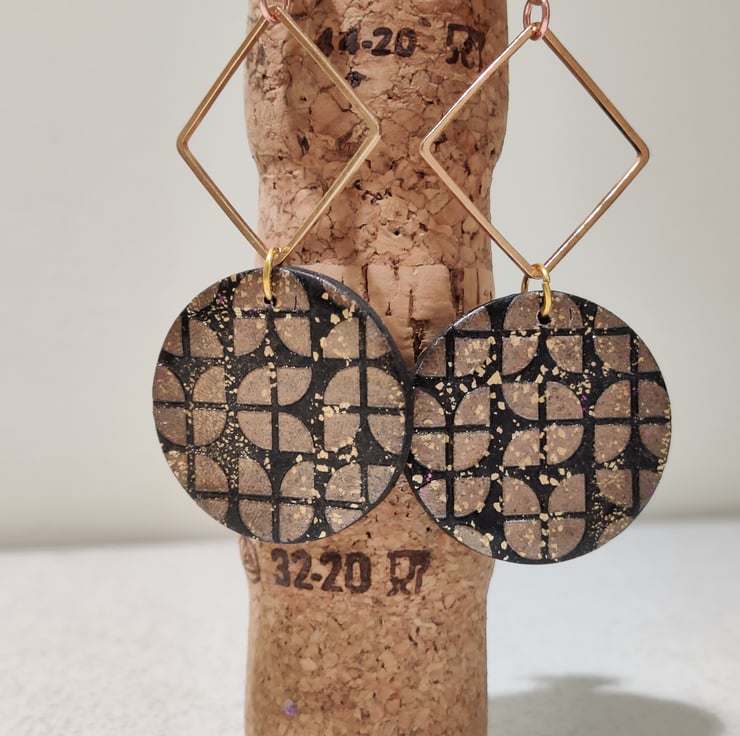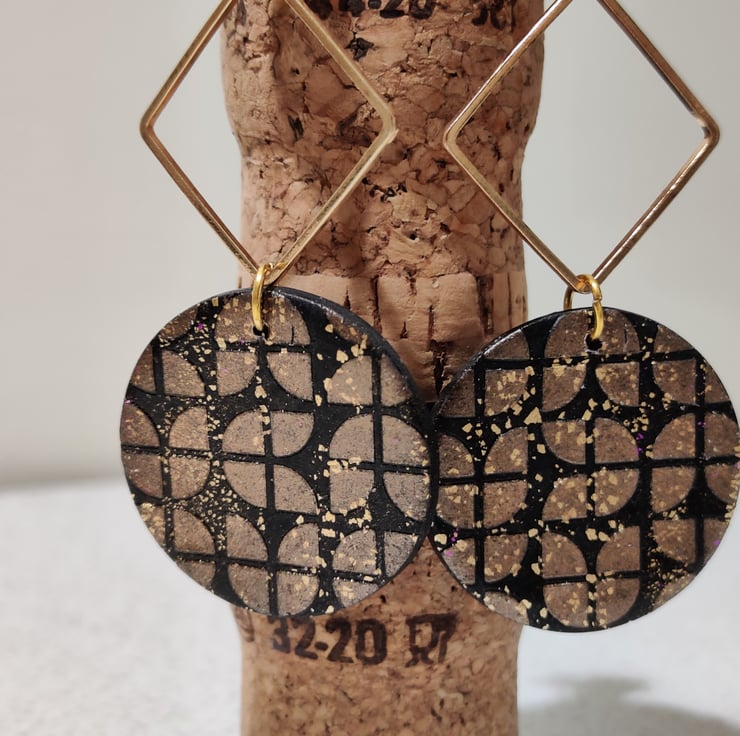 Hand made polymer clay earrings with a geometric pattern and gold flake. Stud fixing which can be painted with hypo allergenic coating for free on request. Please see all photos for close up detail. All products handmade therefore there may be minor imperfections. Each pair sold as seen, message for more info