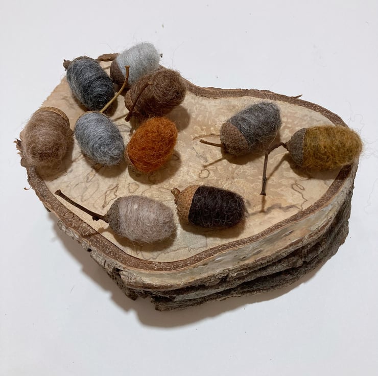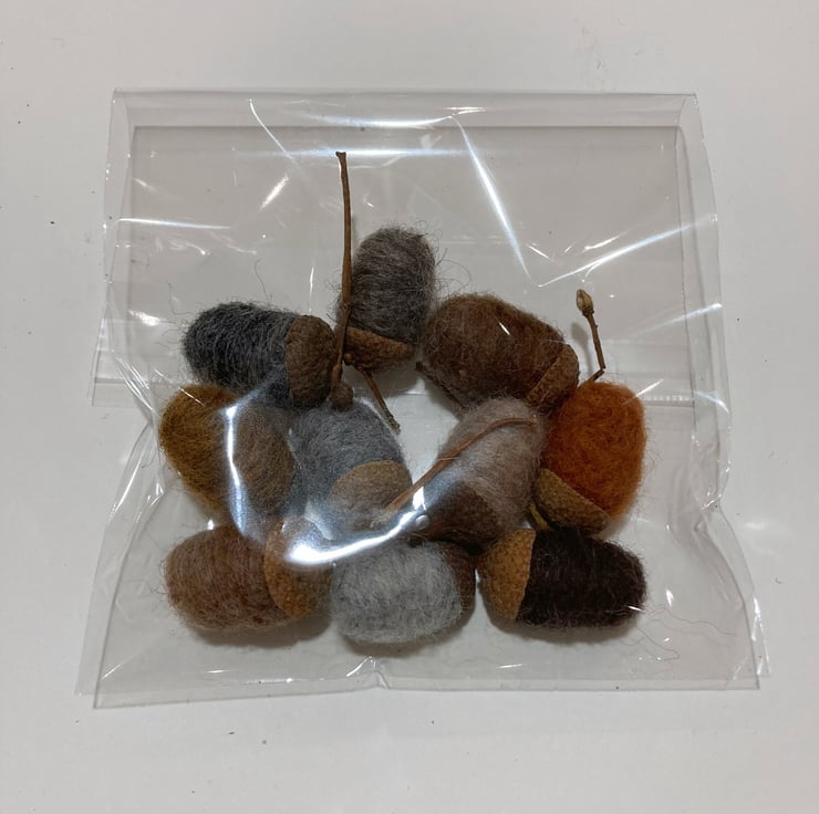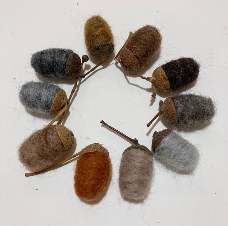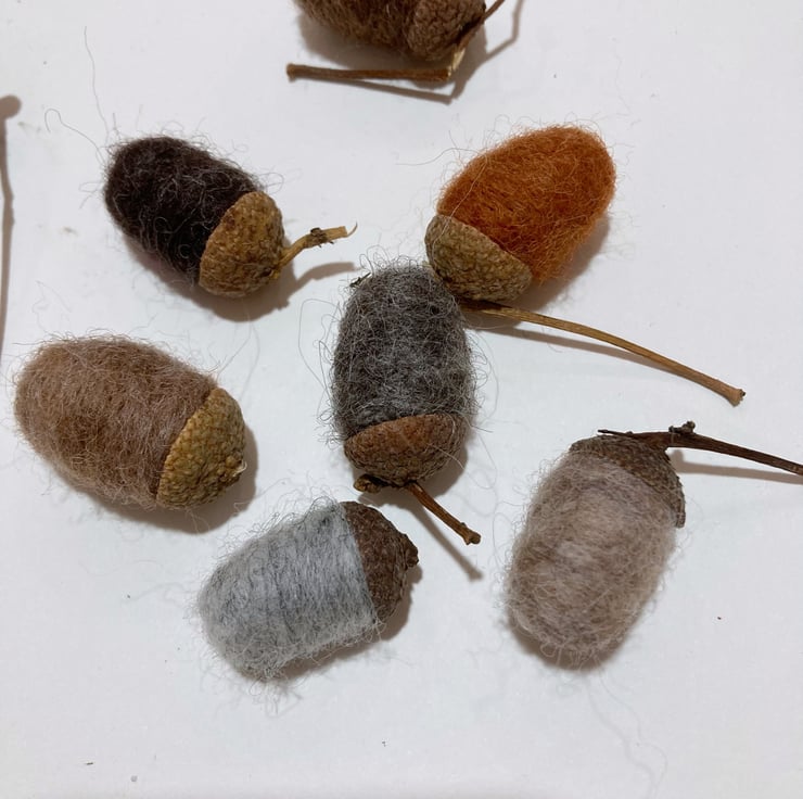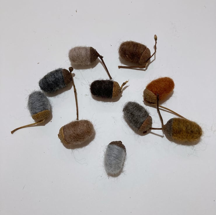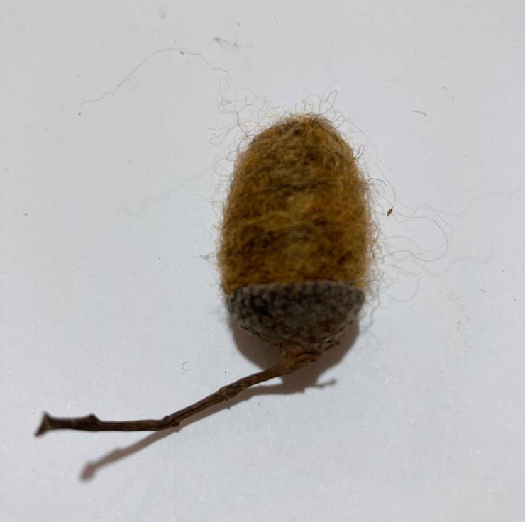 These "acorns" have been needle felted using woollen fibres in shades of brown and grey to give a natural autumnal look. The felted acorn has then been mounted in a natural acorn cap. . The acorn caps have been scavenged from beneath a local oak tree and have been cleaned, dried and sterilised prior to use so as to provide long-lasting decoration.
