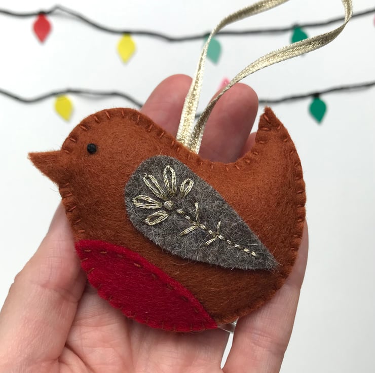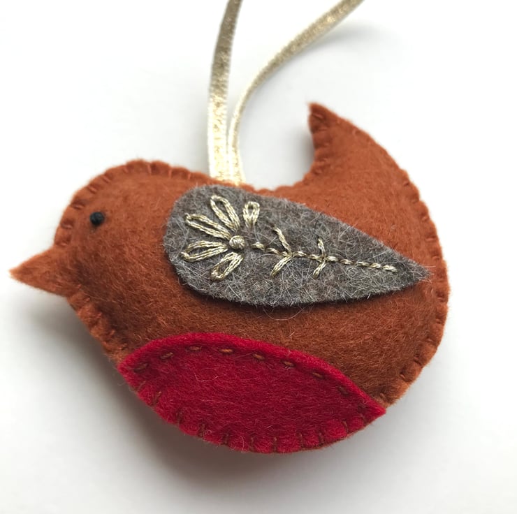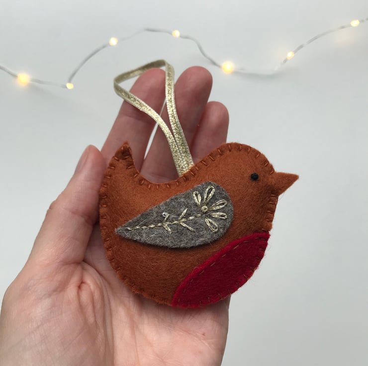 Made from 100% wool felt, this Robin tree decoration is completely hand stitched, embellished with simple embroidery in gold metallic thread. The catches the light beautifully, adding a lovely festive shimmer.