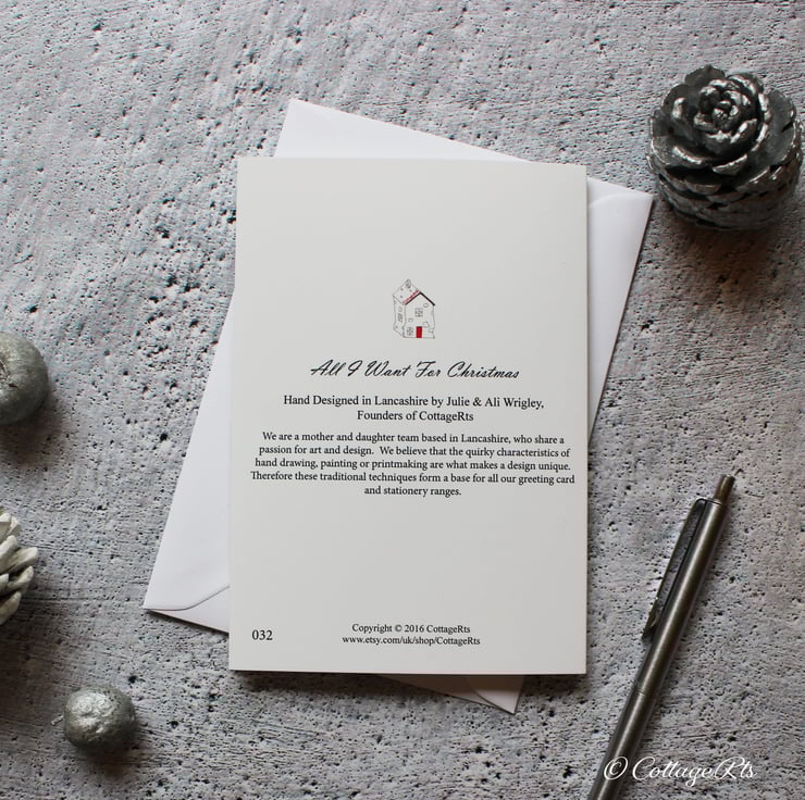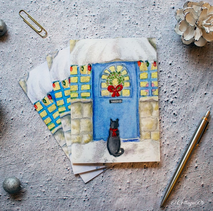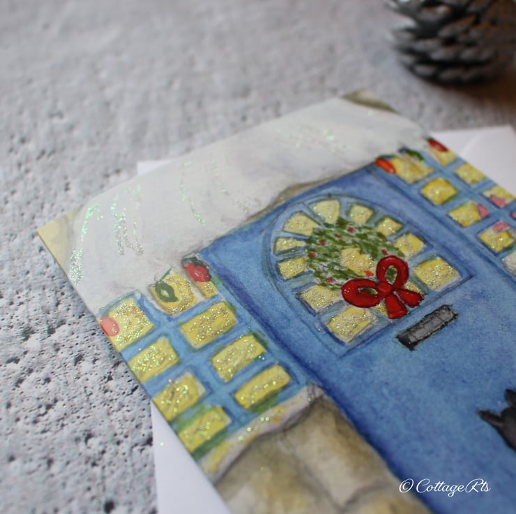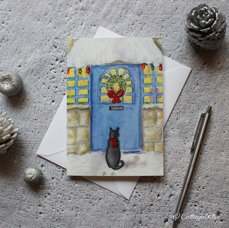 This Cat Christmas card design was originally hand painted in watercolour by us at CottageRts before being digitally printed on to a greeting card. Each card has then been hand finished by us with eco friendly glitter.
