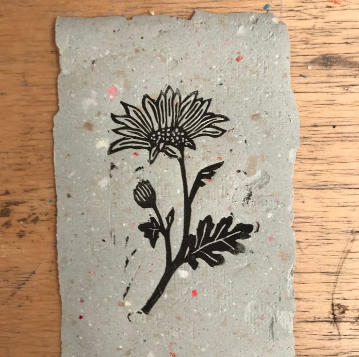 A small linocut print of an oxe-eye daisy in black. It is printed on paper that I've made myself in my studio from recycled paper scraps. The paper has a rich texture and a deckled edge.