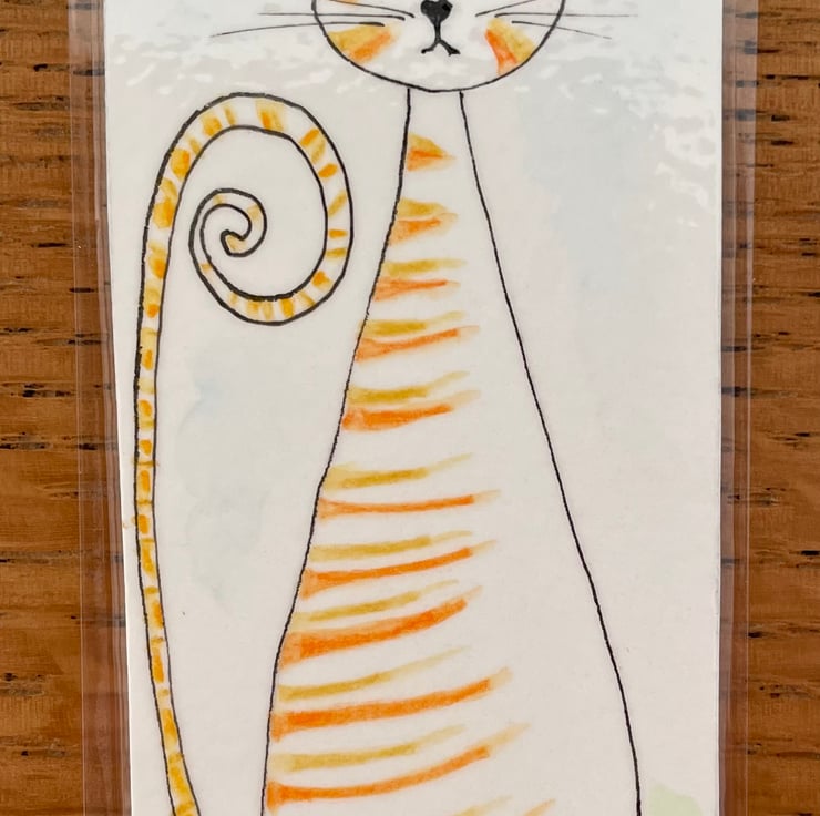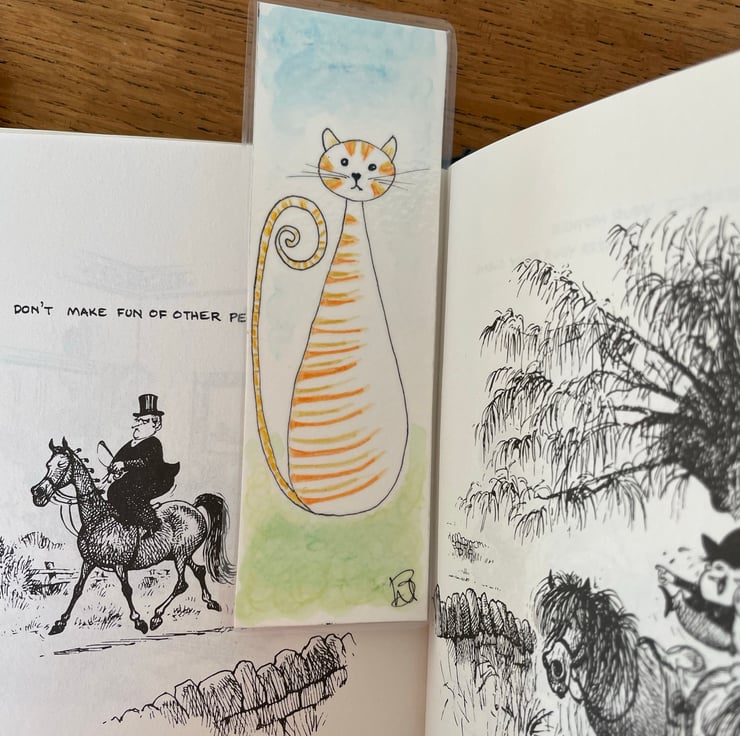 End of line item, I won’t be making these again. Little cute fat cat bookmark, hand painted with watercolour and ink onto 300gsm watercolour paper signed by myself the artist, before being laminated for protection.