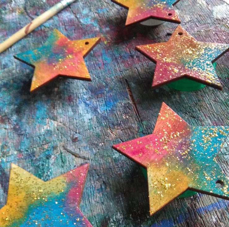 In hand-painting two laser-cut wooden stars, Jo of the Emporium has turned these ordinary wooden items into two tiny splashes of colour and glitz. The design suggests rust-coloured clouds parting at dawn to reveal a deep blue sky sprinkled with flecks of sunlight. Use them as decorations (they come with a shimmering thread to hang them by) or give them as presents to anyone you consider a star. Size: 7cm, from star point to star point.