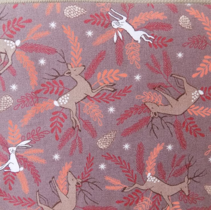 Made from a high quality cotton fabric by Lewis and Irene called ‘New Forest Winter Earth Deer and Hare’, this seasonal design features deer and hare scattered against background of foliage, in brown, beige, crimson and terracotta colours.